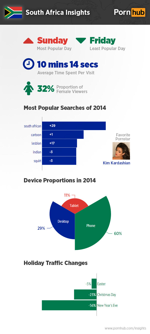 pornhub-south-africa-2014We tip our hats to you, ladies of South Africa, for accounting for a knockout 32% of the Pornhub viewership in your gorgeous country. South Africans are also all about that portable porn, with 71% of their traffic shares originating from mobile devices. Another fun fact? ‘South African’ now tops the list for most popular search term in the land, after an impressive 29 spot climb. Last year’s ‘Indian’ has been knocked down 3 spots.