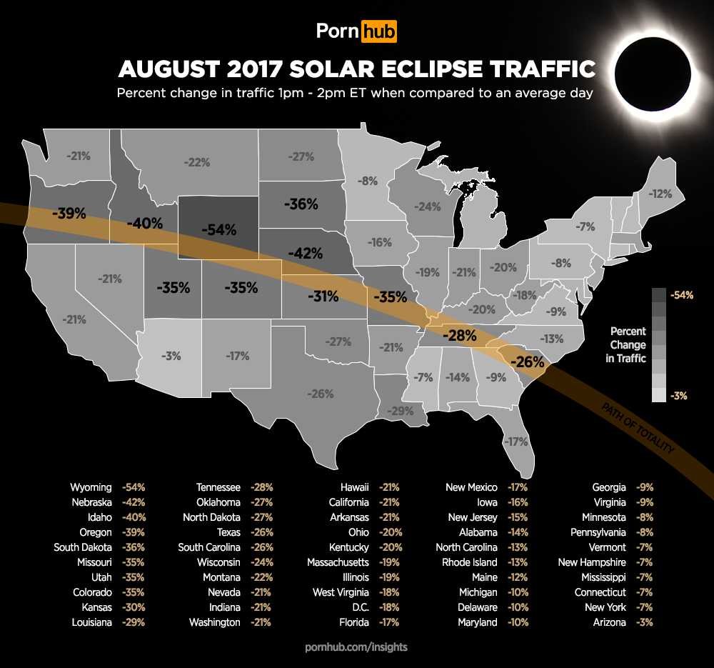 Two amazing things happened on August 21st, 2017. First, the moon passed between the Earth and the Sun, blocking day light to much of the continental U.S. for the first time in nearly 100 years. And second, U.S. traffic to Pornhub plummeted to some of the lowest levels we’ve seen in years, as people’s eyes diverted from pornstars to the real star overhead.