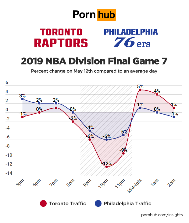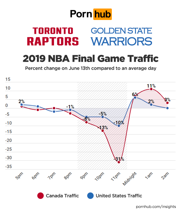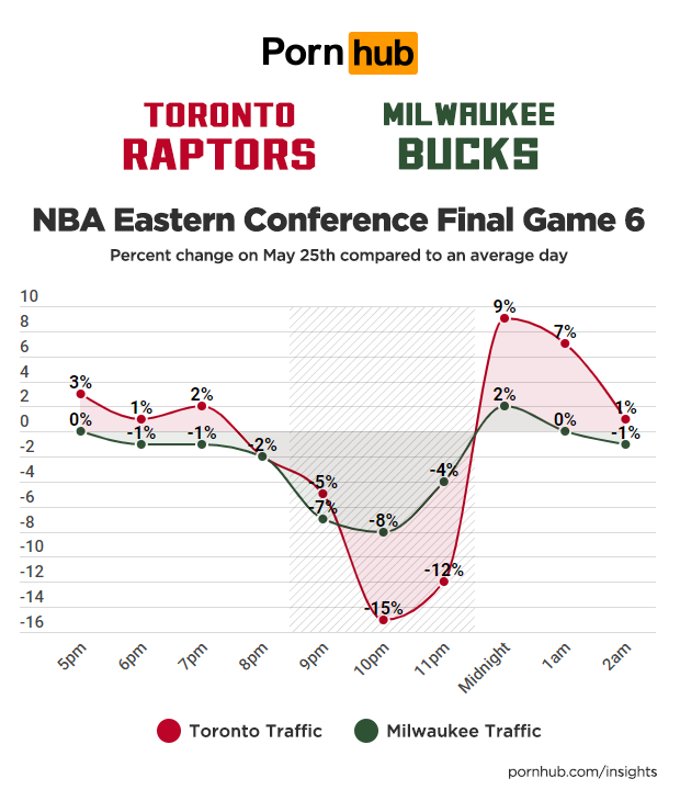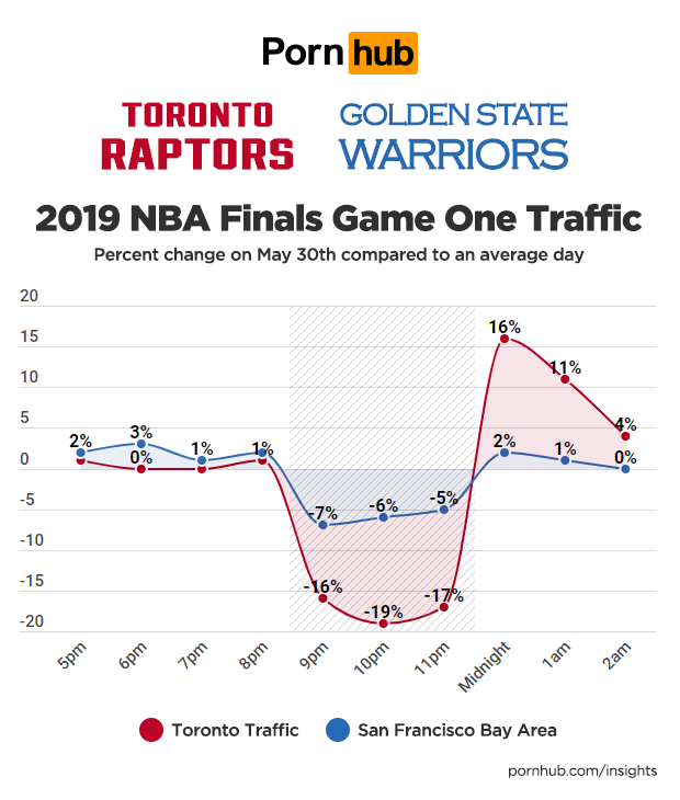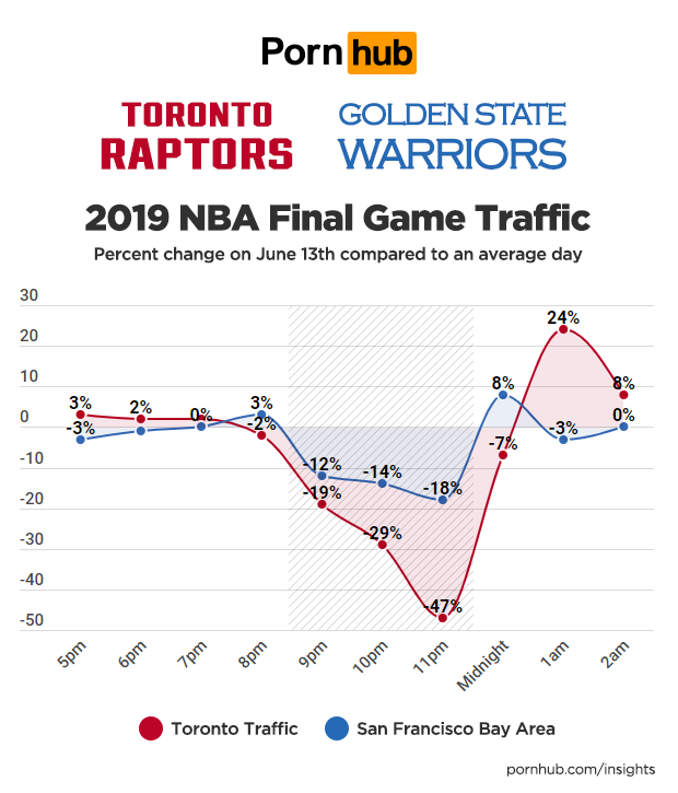 After the game ended, traffic in San Francisco increased +8% above average. As Toronto’s fans were still celebrating their win, Pornhub’s traffic stayed -7% below average, then surged an incredible +24% higher than normal at 1am!