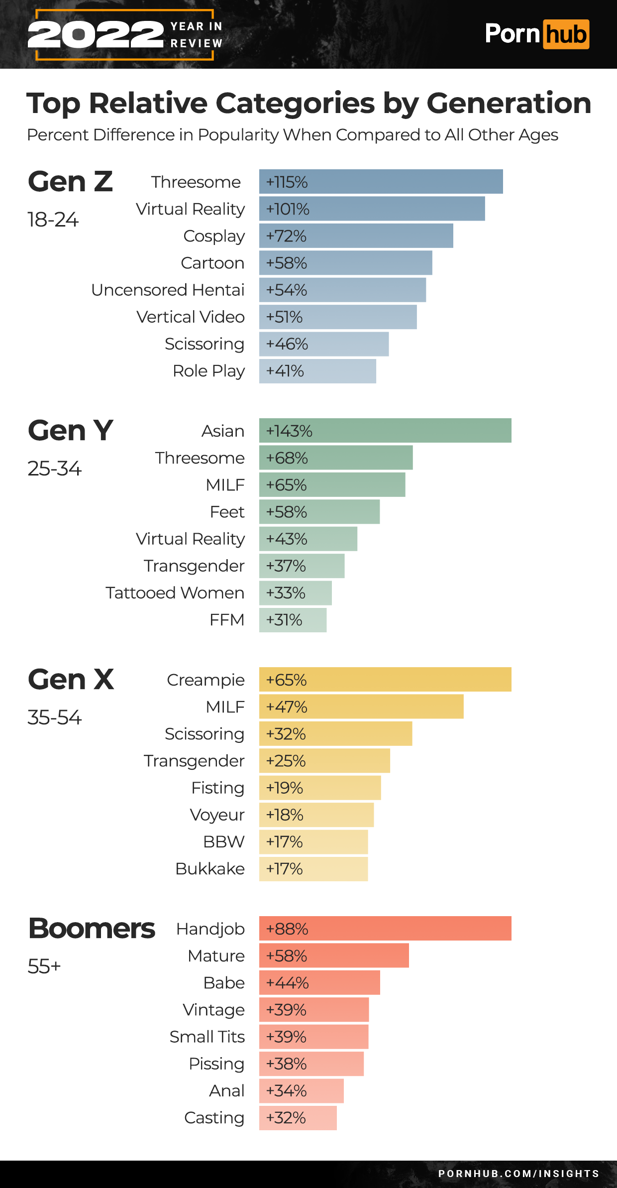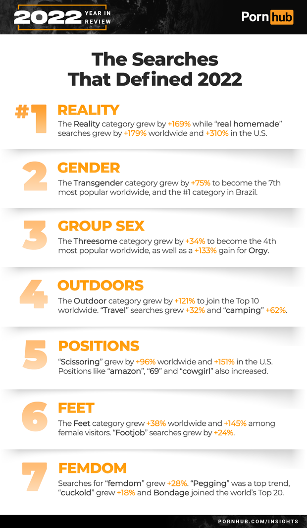 The Reality category saw the biggest gain of +169% in 2022, followed by a +164% increase in Scissoring and +155% for Babysitter (18+). Outdoor and Orgy views more than doubled in the last year. The Gangbang category grew by +88% and Transgender by +75%.