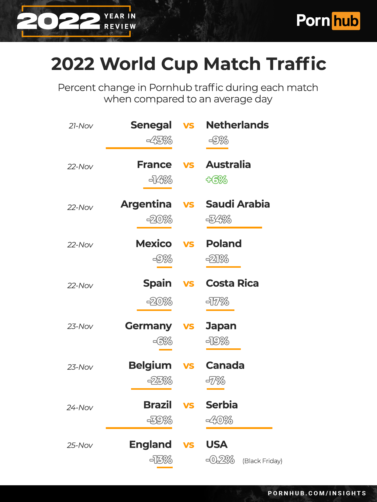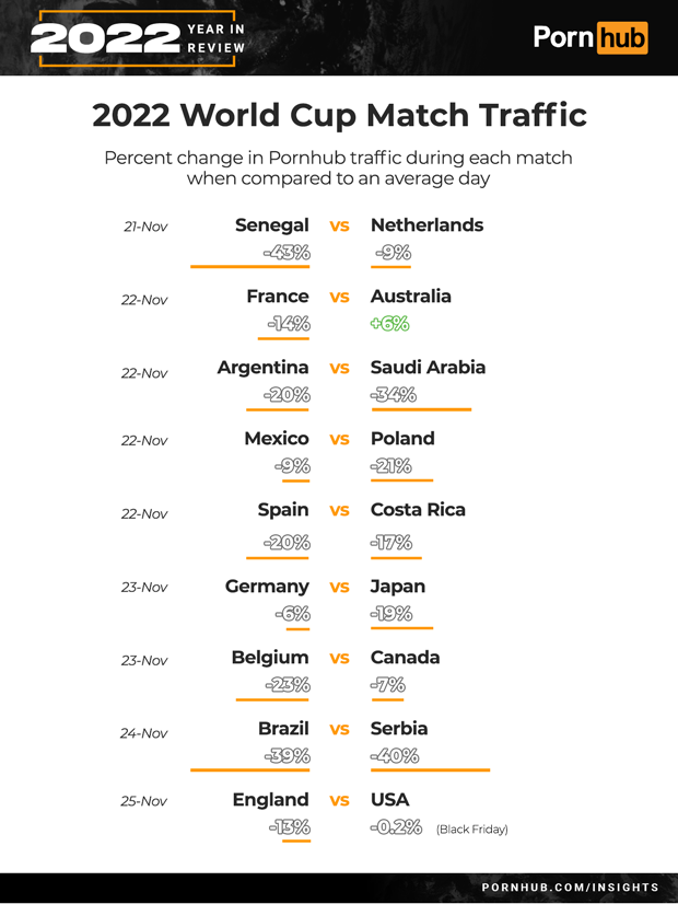 Australia’s traffic increased by +6% during their match with France, but our statisticians theorize that because the match took place at 6am, more people were awake during a normally low traffic time of the day, it increased the likelihood of people visiting Pornhub.