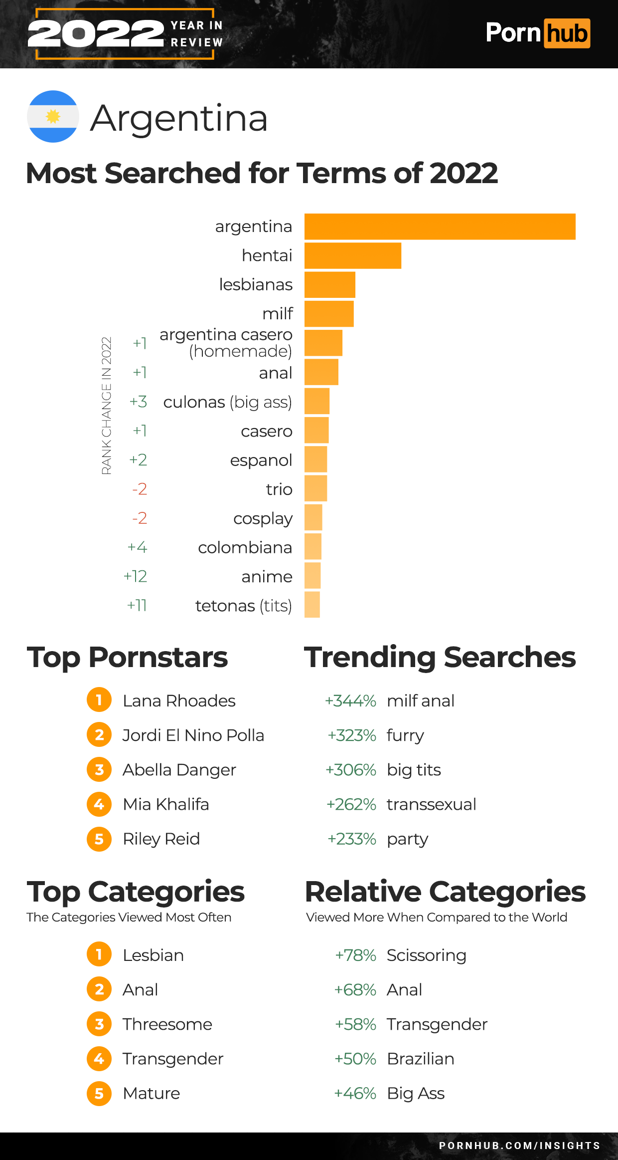 In Argentina, searches for “Argentina”, “hentai”, “lesbianas” and “MILF” all remained the searches of the year. Searches for “big ass” increased in rank +3 as did “anime” by +12 and “tetonas” (tits) by +11. Trending terms for the year included a 323% increase for “furry”, a 262% increase for “transsexual” and 233% increase for “party” searches. Lesbian, Anal and Threesome were the top three most viewed categories in Argentina, but visitors from the country were 68% more into Anal videos and 58% more likely to view Transgender content when compared to the rest of the world.