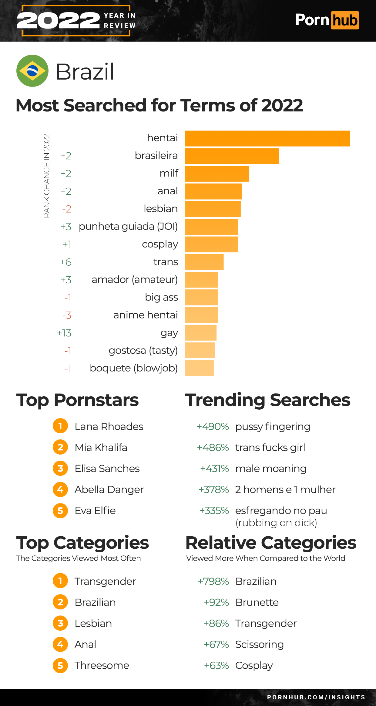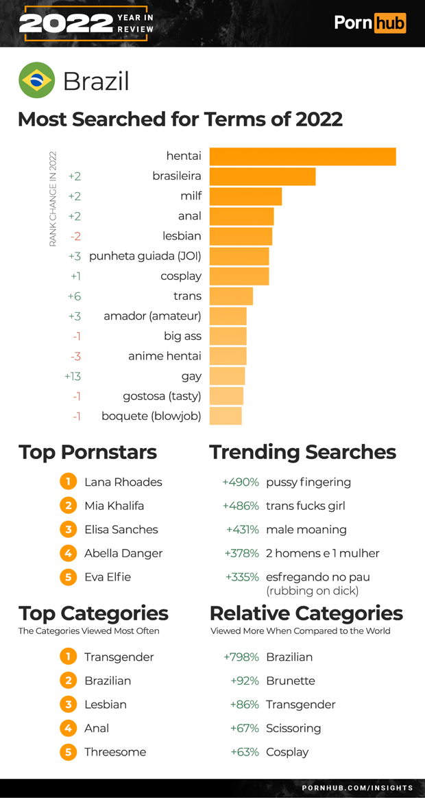 Brazil’s number one search in 2022 was “hentai while “Brasileira” rank increased by +2 to join the top five searches. “Trans” searches grew in rank +6 and “gay” searches by +13. Transgender also became the most viewed category of videos in Brazil, ahead of Brazilian and Lesbian. Trending searches for the year included a 490% increase for “pussy fingering” and a 431% increase for “male moaning”. Brazilians are 92% more likely to view Brunette videos and 86% more likely to view Transgender when compared to the rest of the world.