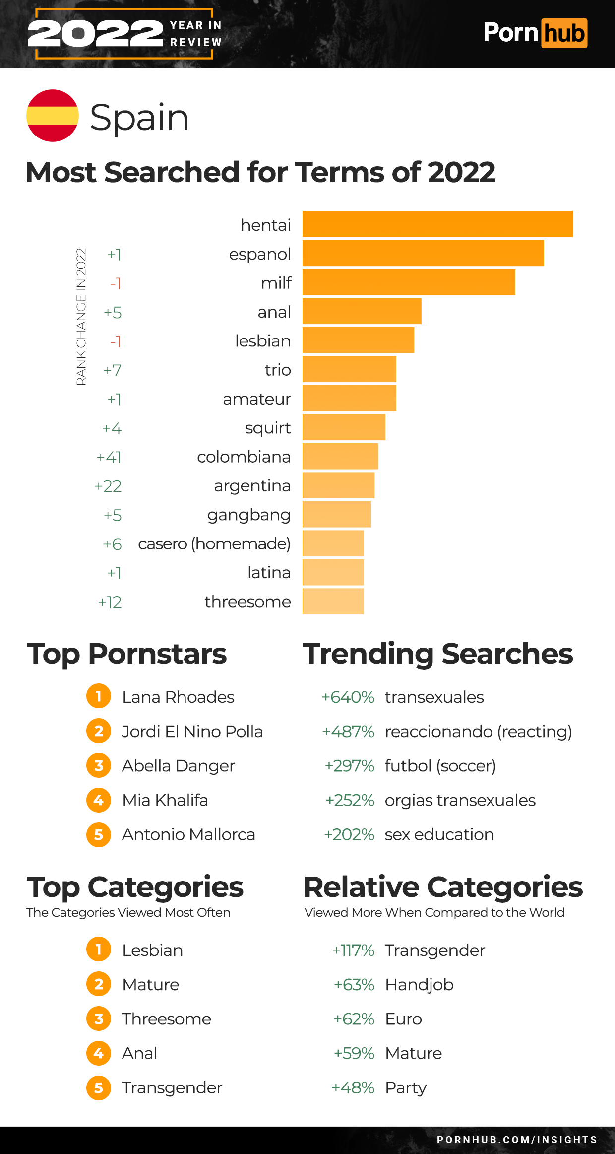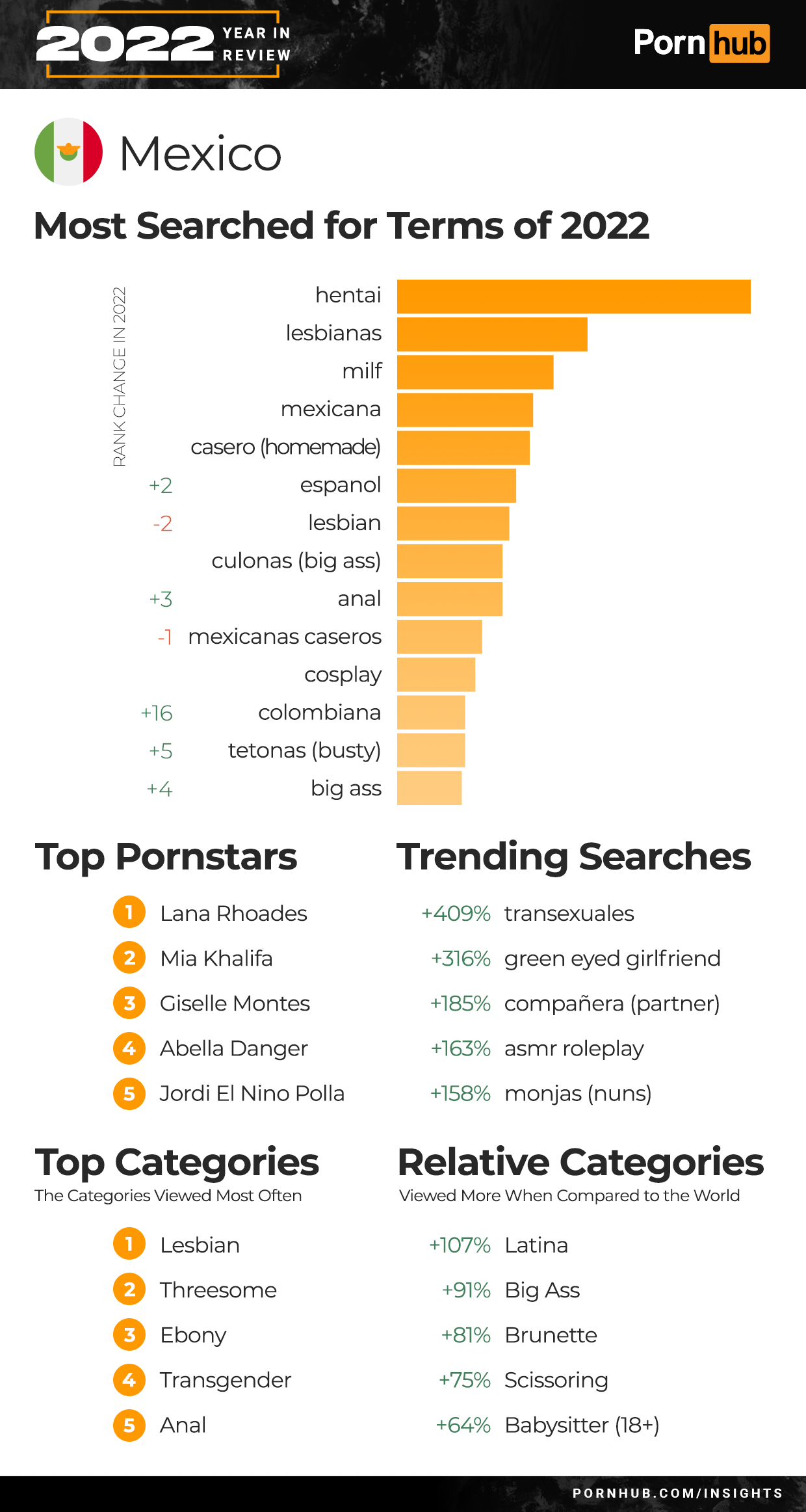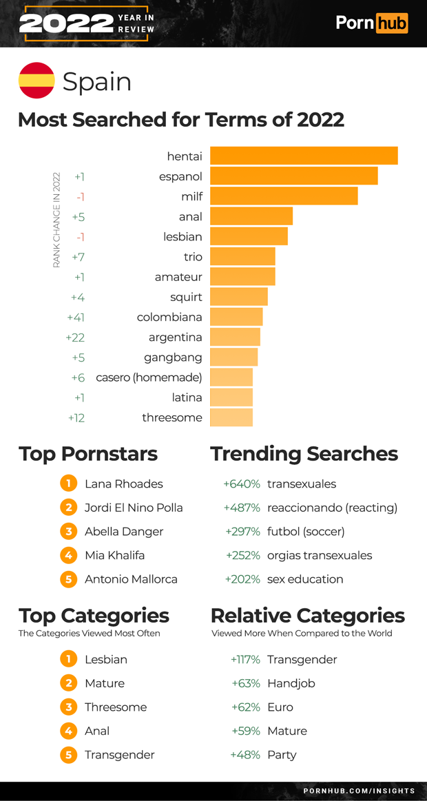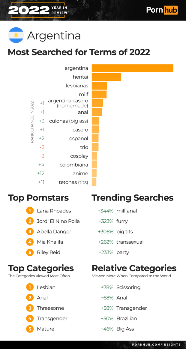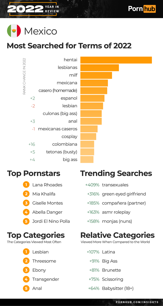 Mexico’s Top 5 searches remained the same for 2022. Leading the list was “hentai” followed by “lesbianas” and “milf”. Searches for “Espanol” grew +2 in rank, and “Colombiana” by +16. Threesome became the 2nd most popular category of video in Mexico, and Transgender the 3rd. Trending searches for 2022 included a +409% increase for “transexuales” and +163% for “asmr roleplay”. Mexicans are +91% more likely to watch Big Ass videos, and +81% more into Brunette when compared to the rest of the world.