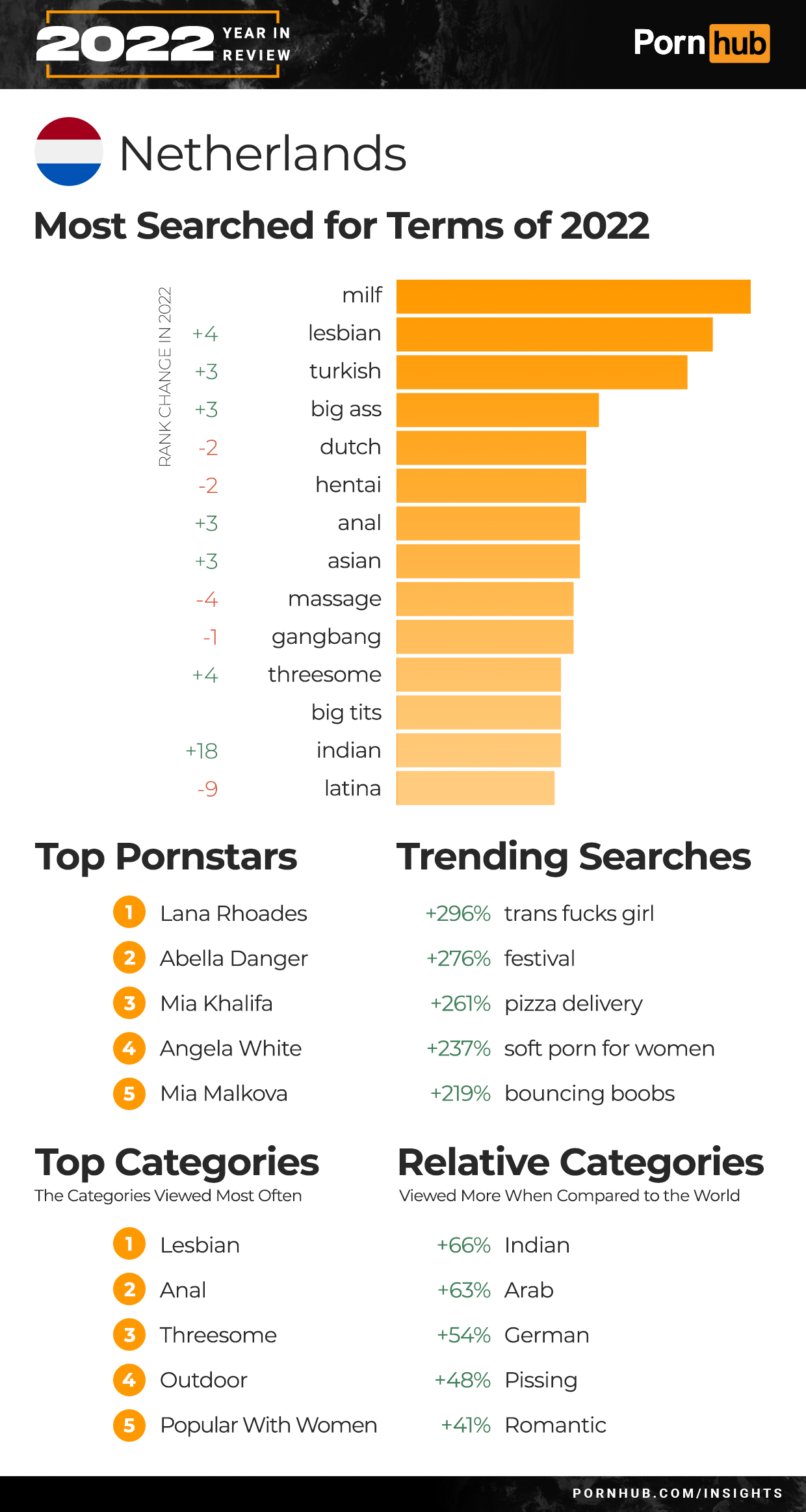 The number one search in the Netherlands continued to be “milf” while “lesbian”, “Turkish” and “big ass” all saw significant gains moving them into the top five searches. Searches for “threesome” gained +4 and Indian +18 over the last year. Trending searches included a 276% increase for “festival”, 261% for “pizza delivery” and 219% for “bouncing boobs”. While visitors from the Netherlands are most likely to view the Lesbian and Anal categories, they are 66% more likely to view Indian videos, 63% more interested in Arab and 48% more into pissing videos when compared to the rest of the world.