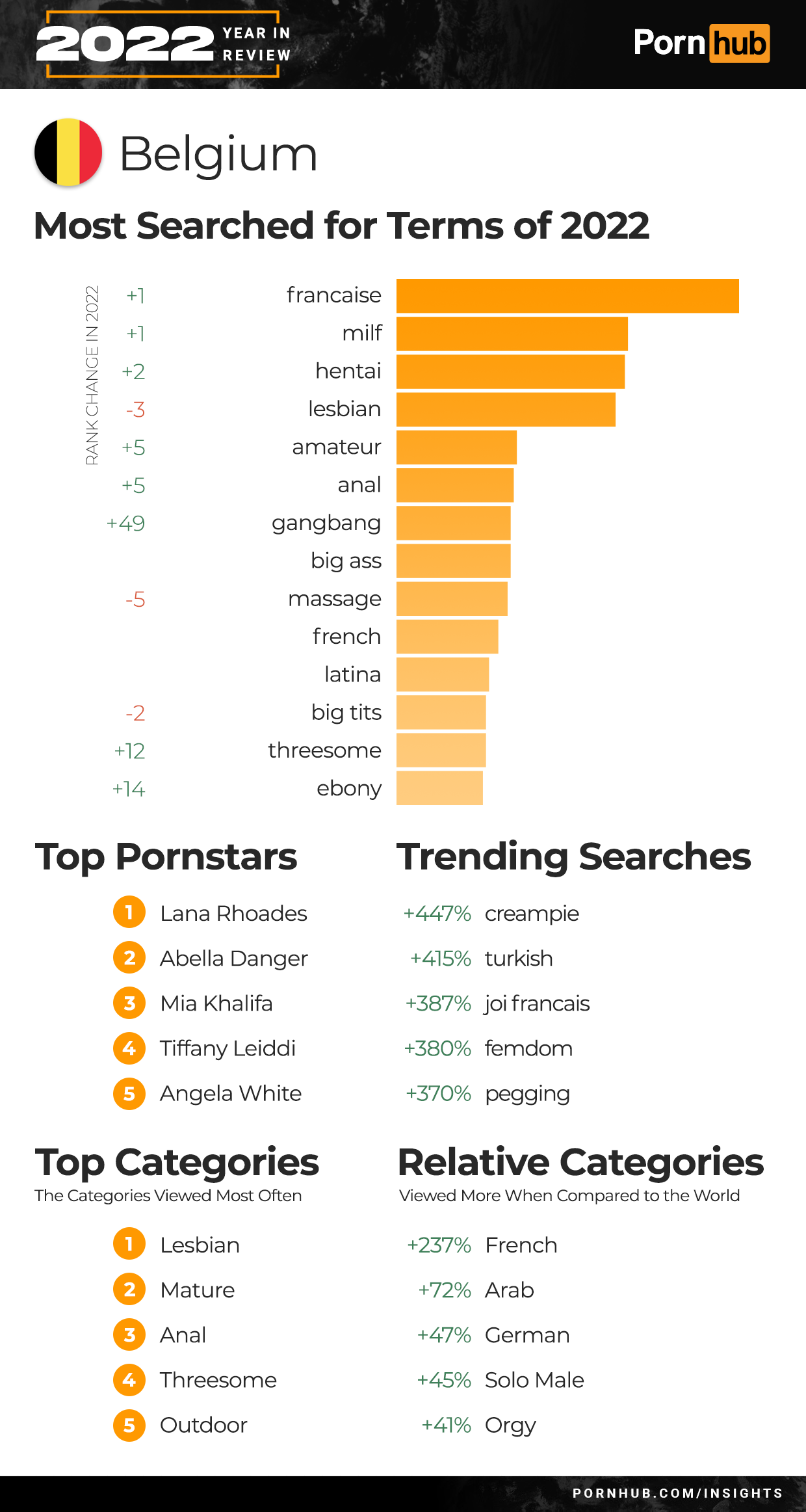 Belgium rounds out our Top 20 countries this year as searches for “Francaise”, “MILF” and “hentai” all moved ahead of “lesbian” to become the top searches. Trending terms included a 447% increase for “creampie”, 415% for “Turkish” and 380% growth in “femdom” searches. Lesbian and Mature were the two most viewed categories in Belgium, while visitors from the country were 72% more interested in Arab videos and 45% more into Solo Male videos when compared to the rest of the world.