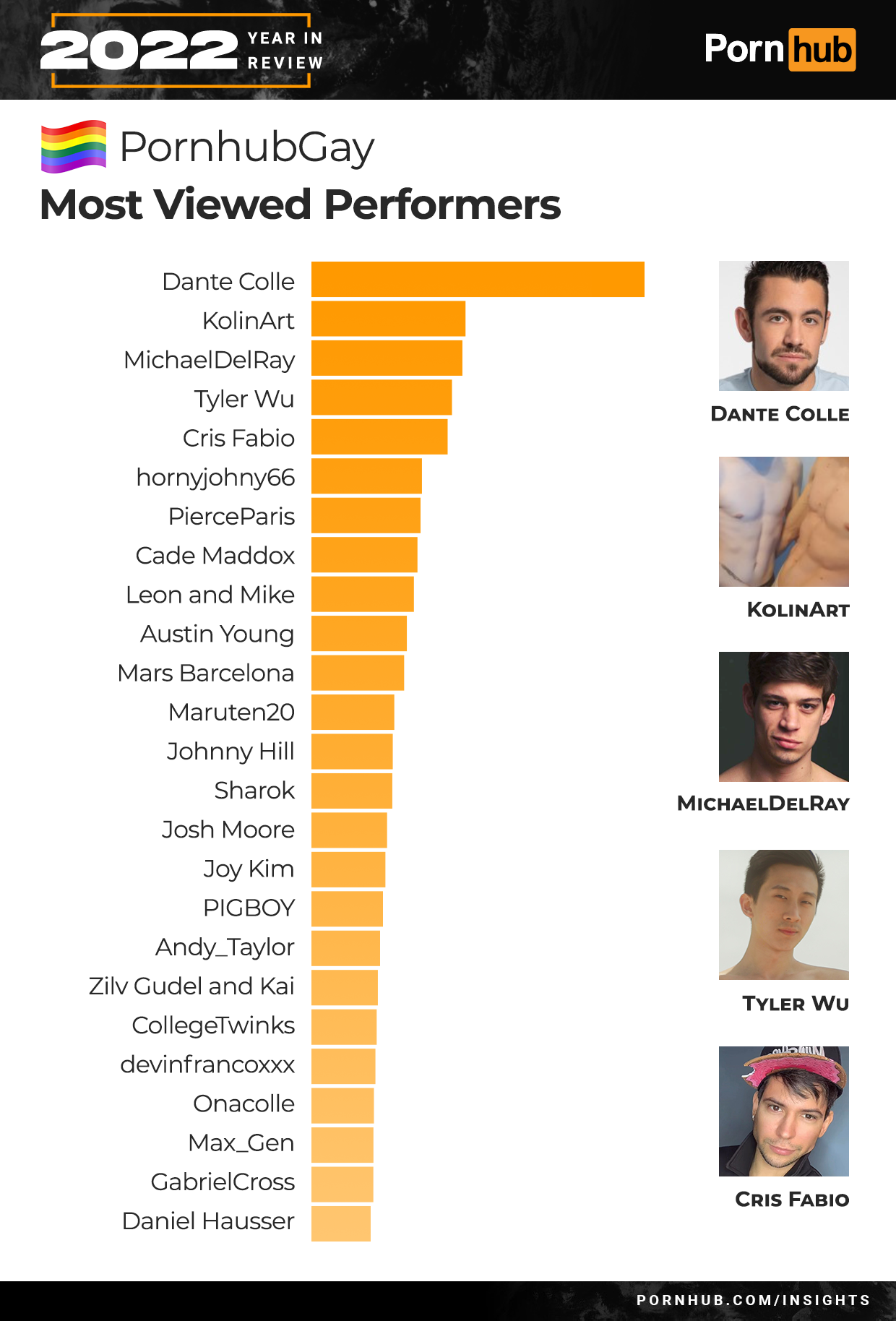 Dante Colle was by far the most viewed gay performer of 2022. He was followed in popularity by KolinArt, MichaelDelRay, Tyler Wu and Cris Fabio.