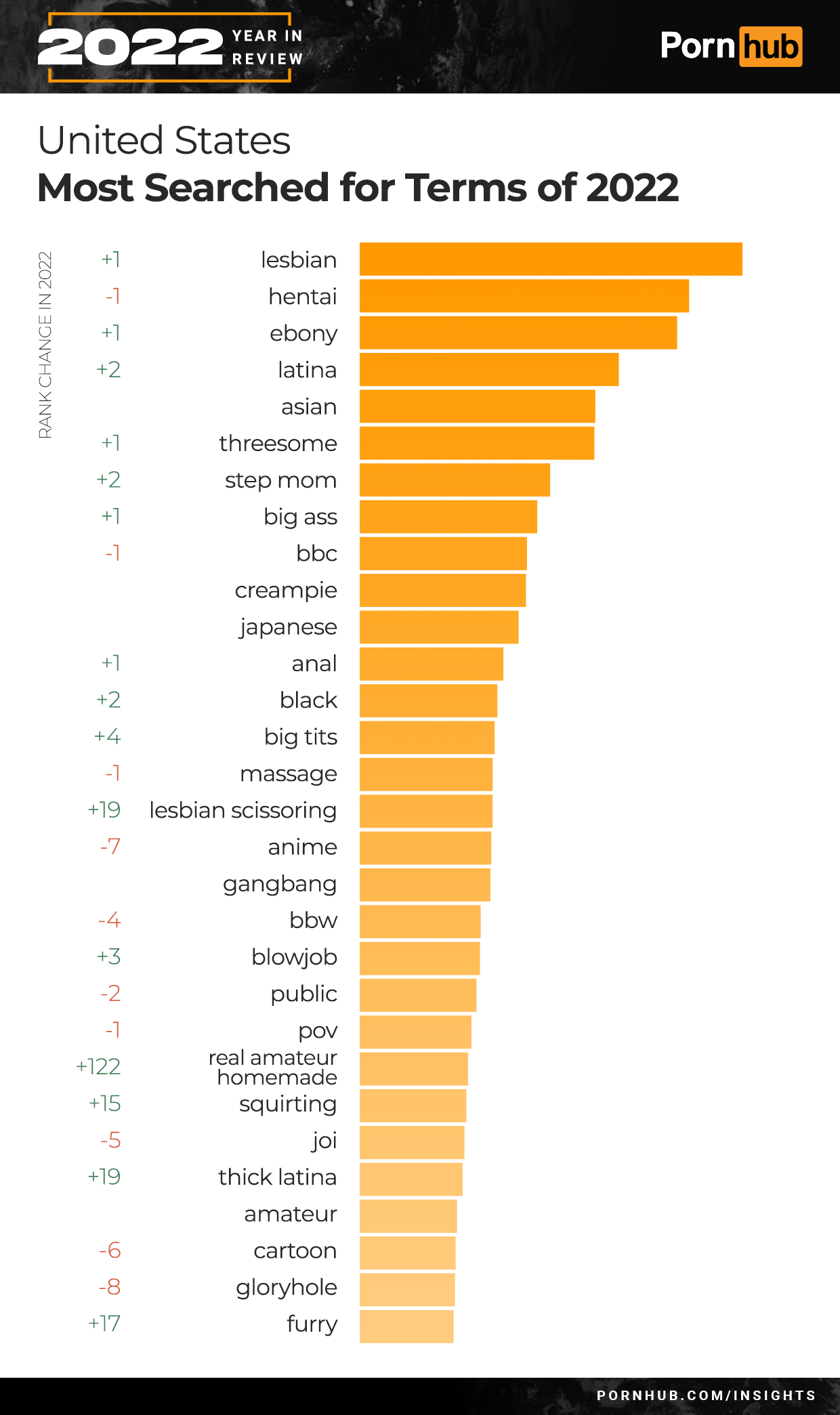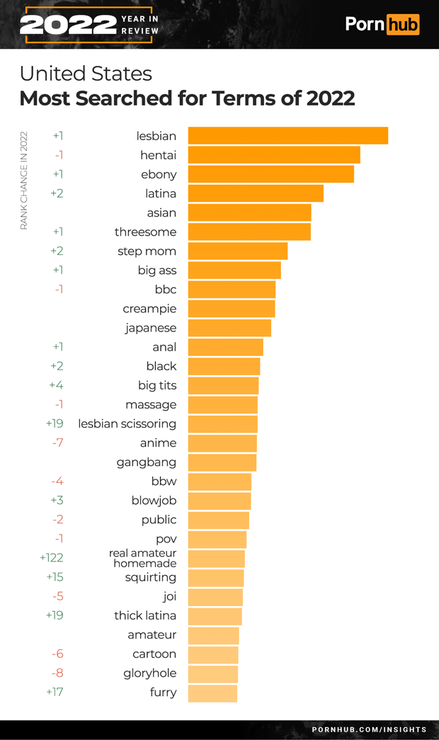 2022 saw “lesbian” become the favorite search in the United States, replacing last year’s favorite “hentai”. In 2019 and 2017 the top US term was “lesbian”, as was “milf” in 2018.