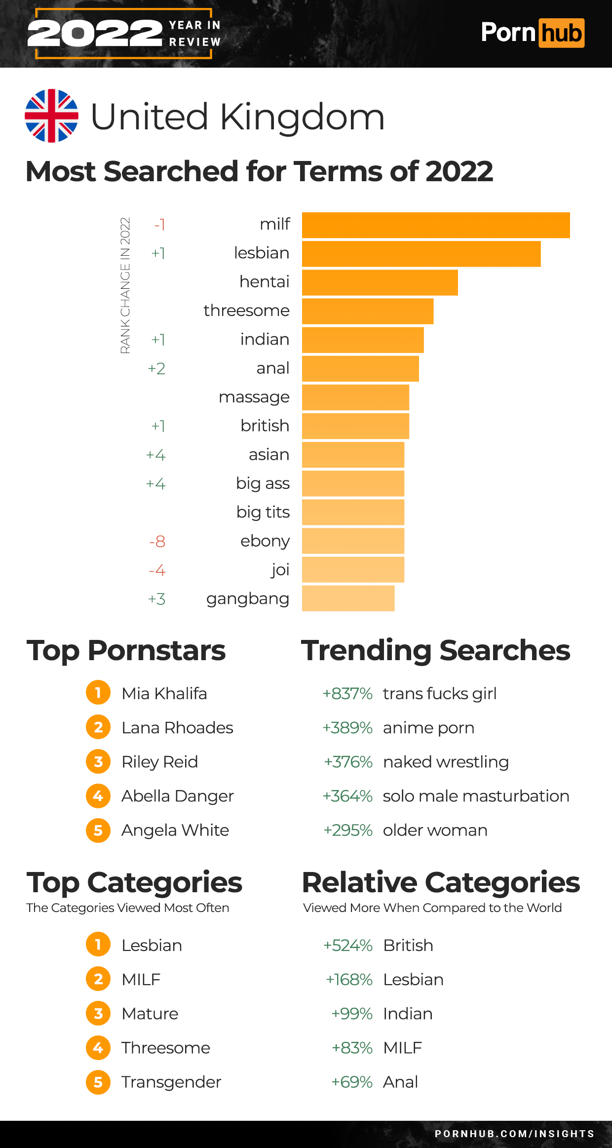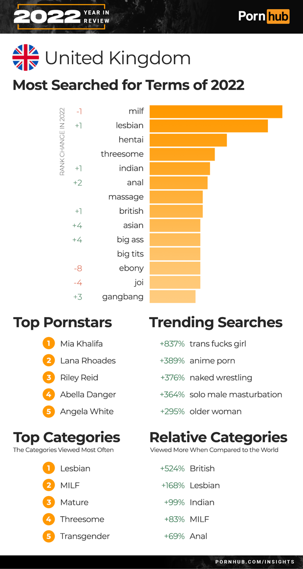 In 2022, “milf” overtook “lesbian” to become the #1 search in the United Kingdom. “Anal” searches increased in rank +2, and both “Asian” and “big ass” grew +4. “Ebony” related searches dropped by –8 positions, while “gangbang” grew +3. This year “British” searches come in 8th on the list.