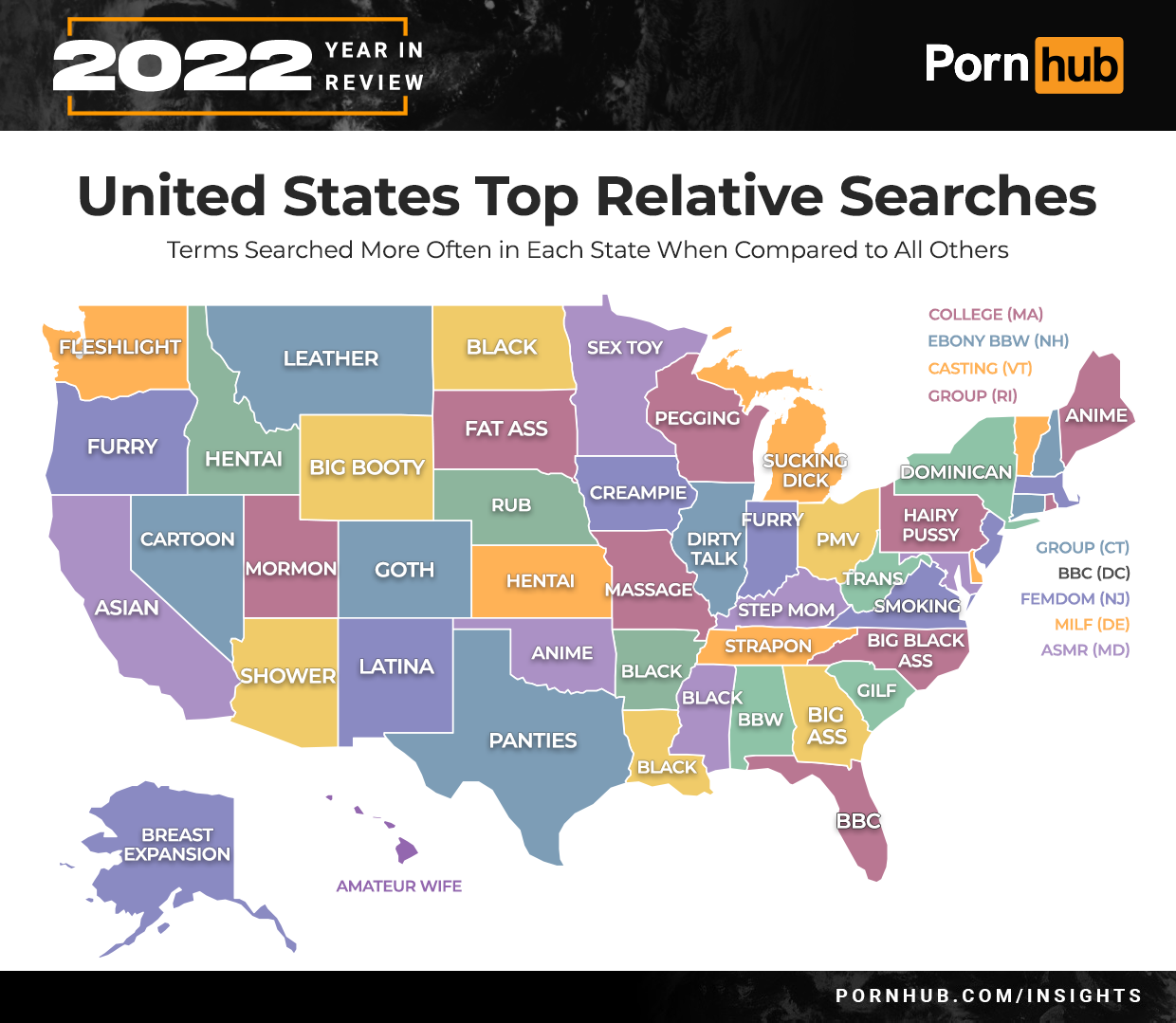 “Ebony” and “Latina” searches moved ahead of “Asian” to round out the Top 5 US Searches. Americans were more into “big ass” than “bbc” (big black cock) in 2022. “Big tits” increased +4, while “BBW” (big beautify woman) went down -4 on the list.