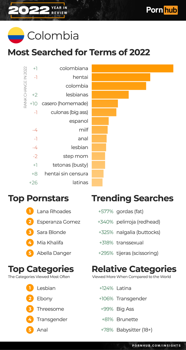 In Colombia, searches for “colombiana” grew +1 to take over the #1 search in place of last year’s favorite “hentai”. Searches for “casero” (homemade) gained +10 in rank, as did “tetonas” (busty) and a +26 rank increase for “Latinas”. Trending searches for the year included a 577% increase in “gordas” (fat) searches, 340% increase for “pelirroja” (redhead) and a 318% increase for “transsexual”. Threesome and transgender both moved into Colombia’s Top Five categories of videos, and visitors were 124% more likely to view Latina videos, 106% more into Transgender and 99% more into Big Ass when compared to the rest of the world.