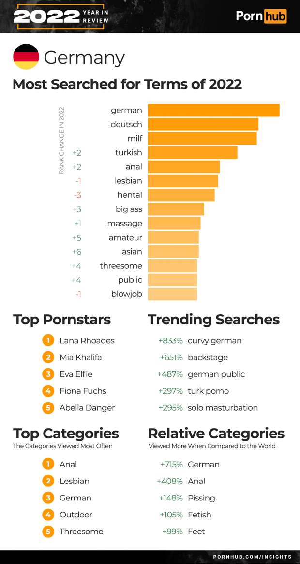 Germans love home-grown porn, with “german” and “deutsch” topping the list for another year. “Big ass” searches were up +3 spots, and +4 for “threesome”. Trends for 2022 included a +833% growth in “curvy german” searches, +487% more for “german public” and +297% for “turk porno”. Anal is the most popular category of video in German, and Outdoor and Threesome themed videos joined the Top 5. Germans are +408% more likely to view Anal videos, and +148% more into Pissing than the rest of the world.