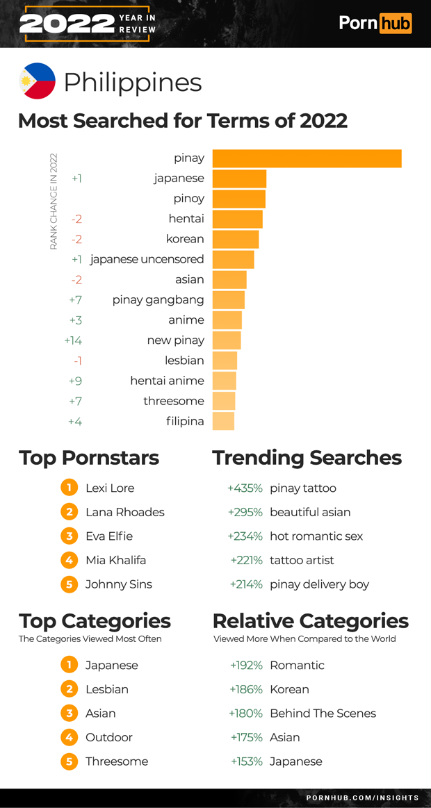 In 2022 “pinay” continued to be the number one search in the Philippines while “Japanese” moved up one position to become the second most popular search ahead of Pinoy. Searches including the term “pinay gangbang” grew by +7 and “new pinay” by +14. Japanese was the most viewed category in the Philippines ahead of lesbian and Asian. Trending searches for the year included a 435% increase for “pinay tattoo” and a 234% increase for “hot romantic sex”. When compared to the rest of the world visitors from the Philippines are 192% more likely to view the Romantic category and 180% more likely to view Behind The Scenes videos.