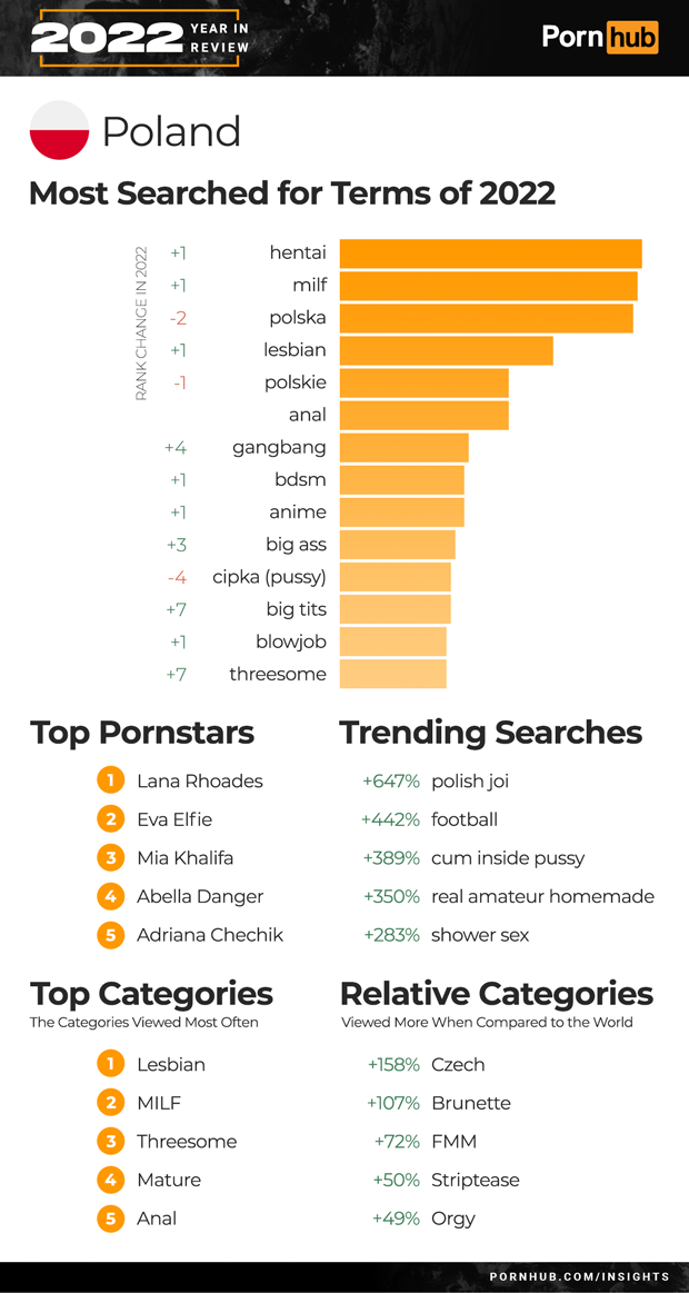 In 2022 “hentai” and “milf” both moved up one position ahead of “polska” to become the top searches in Poland. “Gangbang” searches increased +4 and “threesome” increased +7. Trending searches for the year included a 442% increase for “football” and a 350% increase for “real amateur homemade”. While visitors from Poland watch Lesbian category videos the most, they are 158% more likely to view Czech videos, 107% more into Brunette and 49% more into Orgy videos, when compared to the rest of the world.