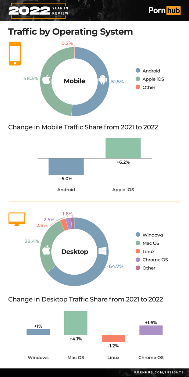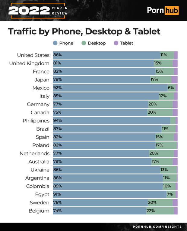 In 2022, mobile devices made up 97% of all Pornhub traffic, with smartphones being 84%. Tablets saw a –34% in traffic share from 2021 to 2022, making up only 3% of Pornhub’s traffic. Desktop usage dropped a further –6%.