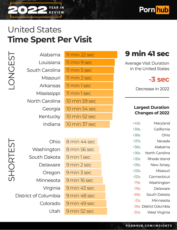 The average visit duration of the United States was 9 minutes 41 seconds, a decrease of -3 seconds in 2022. Alabama became the longest visiting state with an increase of +36 seconds to 11 minutes 22 seconds. Ohio’s time dropped by –38 seconds to make it the shortest visiting state at 8 minutes 44 seconds.