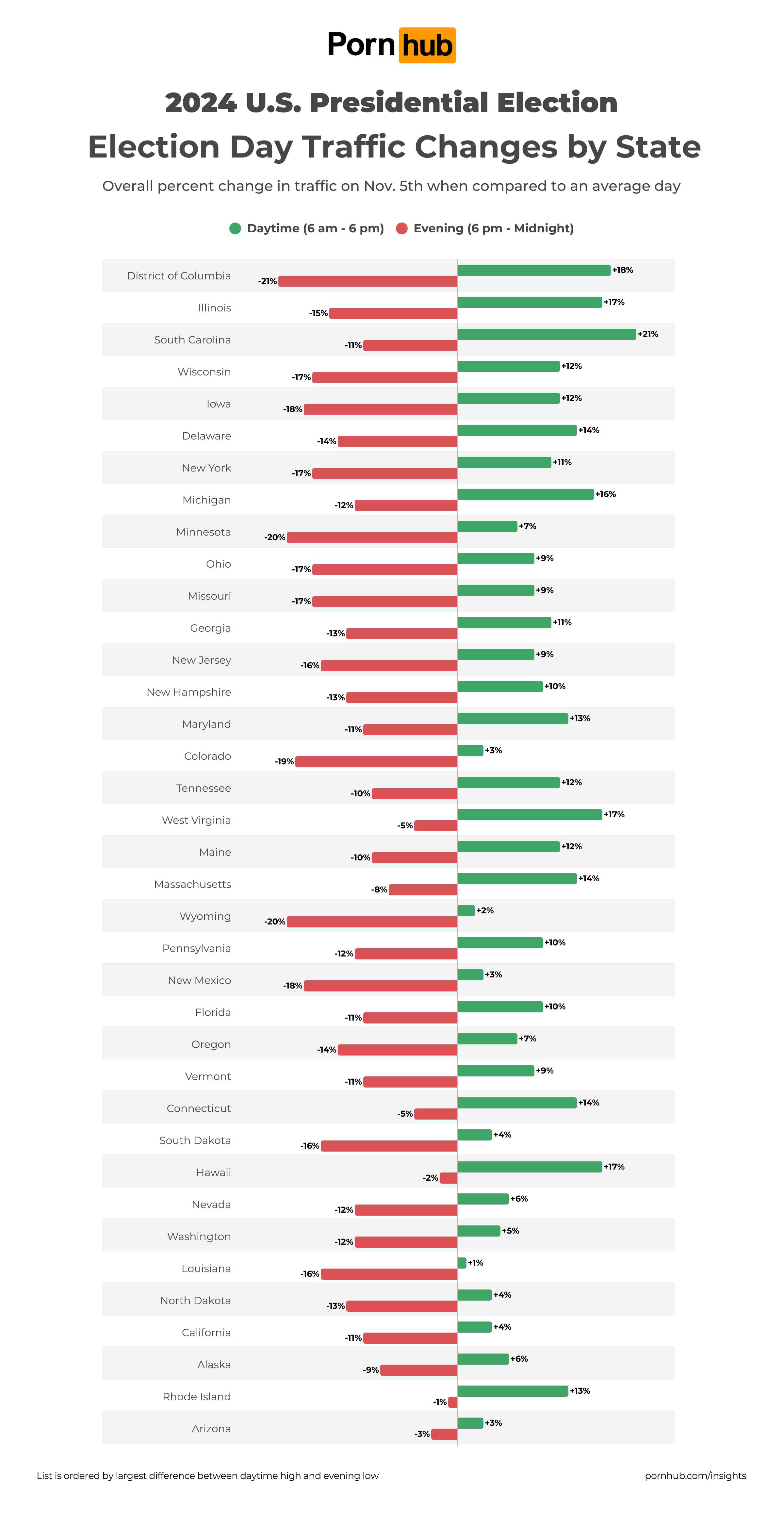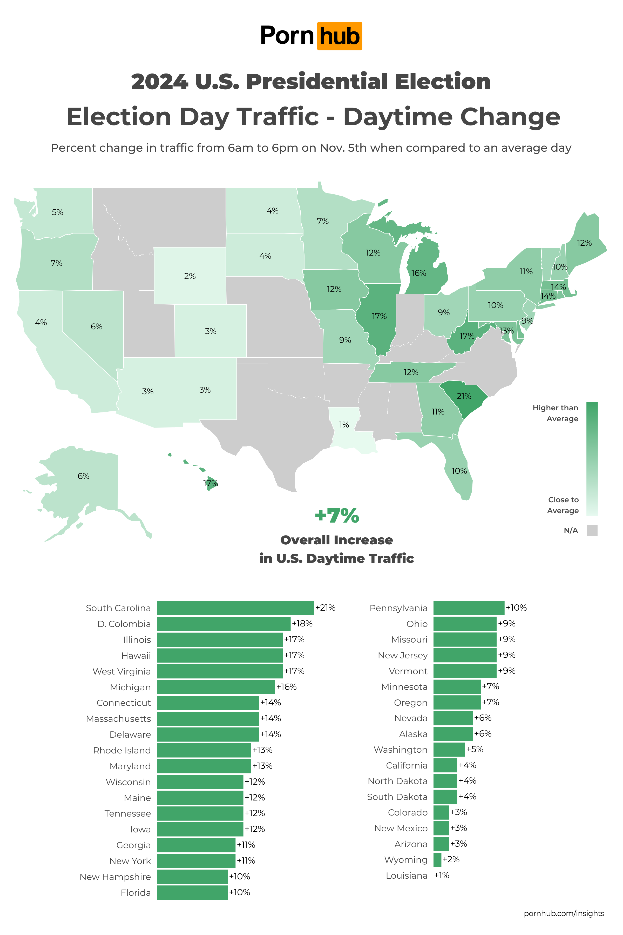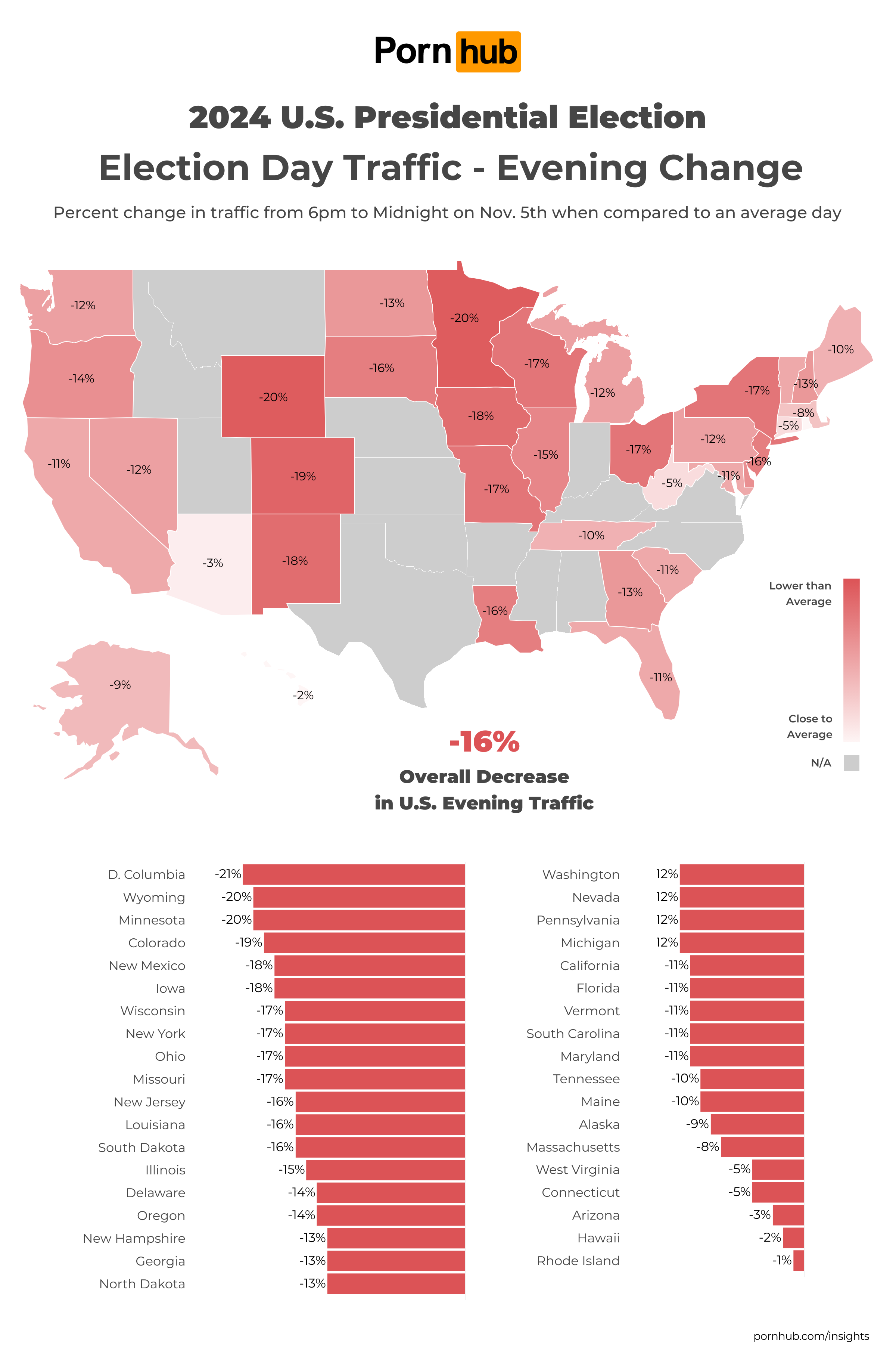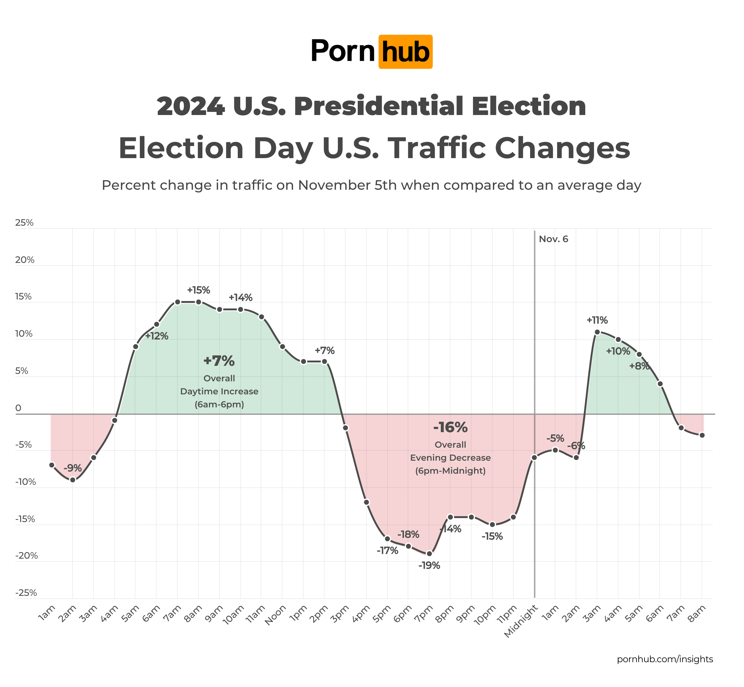 From 3 p.m. to 2 a.m. (November 6), traffic remained below average. By 7 p.m., traffic reached its biggest hourly drop, at –19%. With millions of Americans visiting Pornhub every day, a nearly 20% drop in traffic is substantial, meaning a difference of tens of millions of people. After 7 p.m., traffic slowly started going back to average, but it wasn’t until 3 a.m. the next day those numbers spiked again, at +11%. We can only assume after a long night of watching each state count the ballots that people needed to take the edge off.