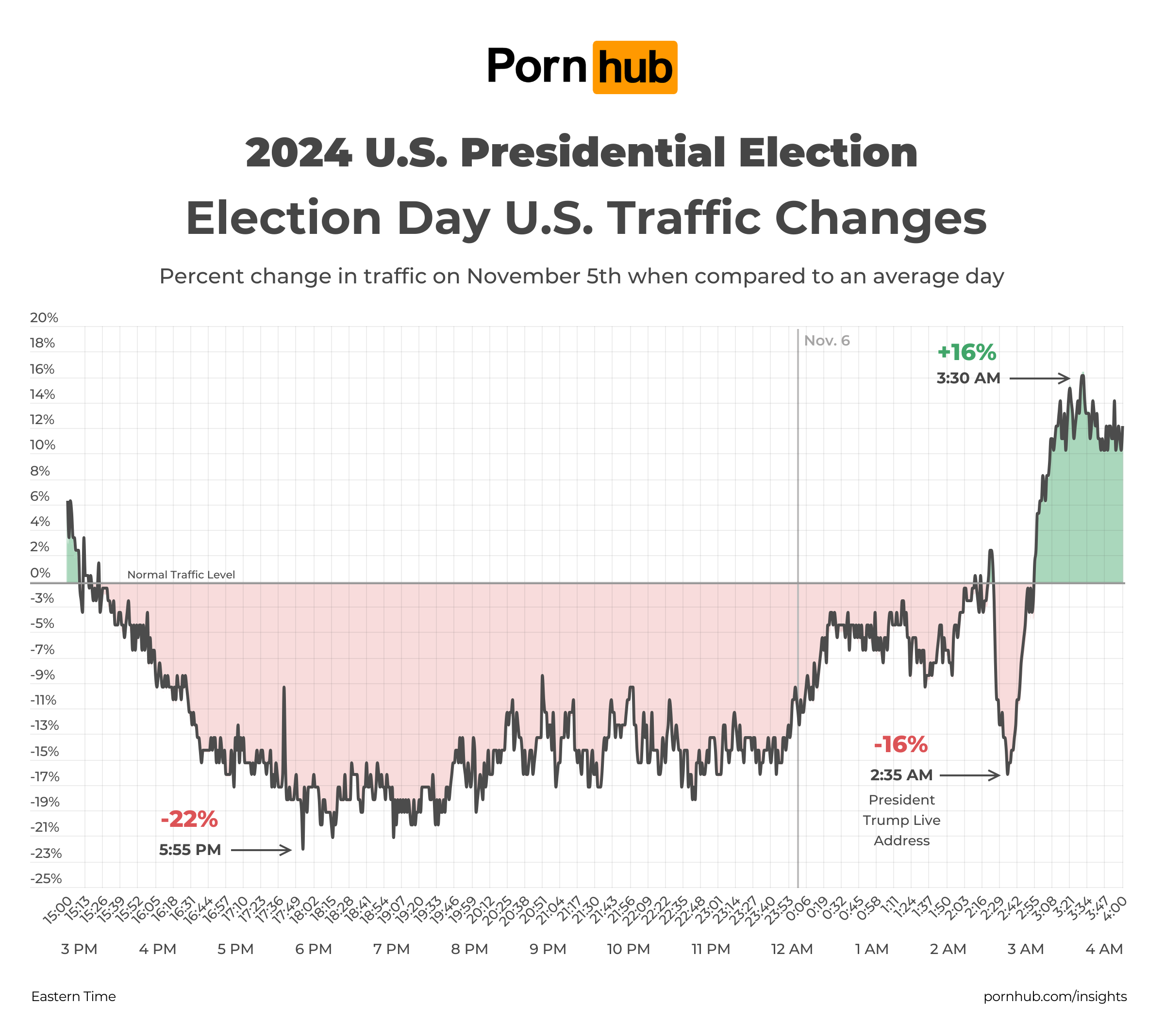 On a minute-by-minute level, our statisticians can see 5:55 p.m. had the biggest drop in traffic, at –22%. By 2:35 a.m., when Trump came out to give a speech, traffic was –16% below average. Within the hour, at 3:30 a.m., hordes of Americans flocked back to the hub, launching traffic to +16% above average.