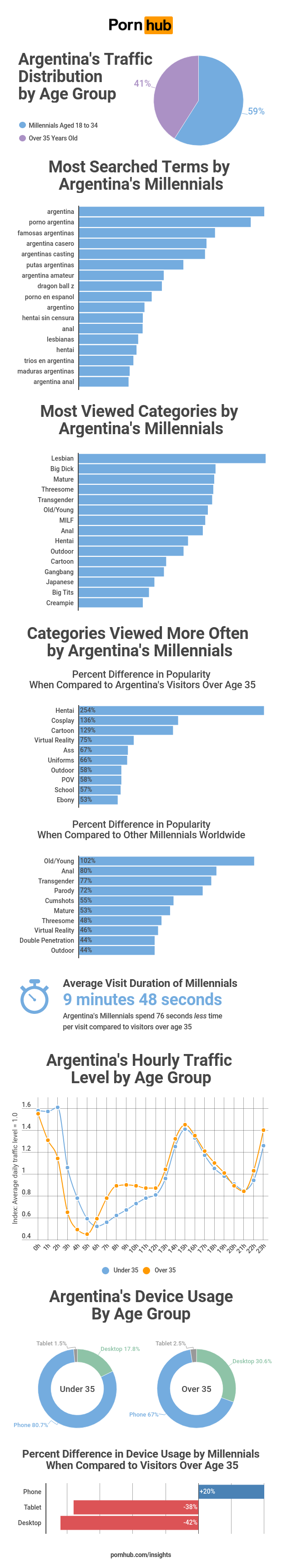 In this edition of Pornhub Insights, we’re joined by our friends at UNO to take a closer look at Argentina’s Millennials, specifically those visitors between the ages of 18 to 34 who make up 59% of Pornhub traffic from Argentina. Millennials last an average 9 minute and 48 seconds when they visit Pornhub, which means they come and go 76 seconds faster than visitors over 35.