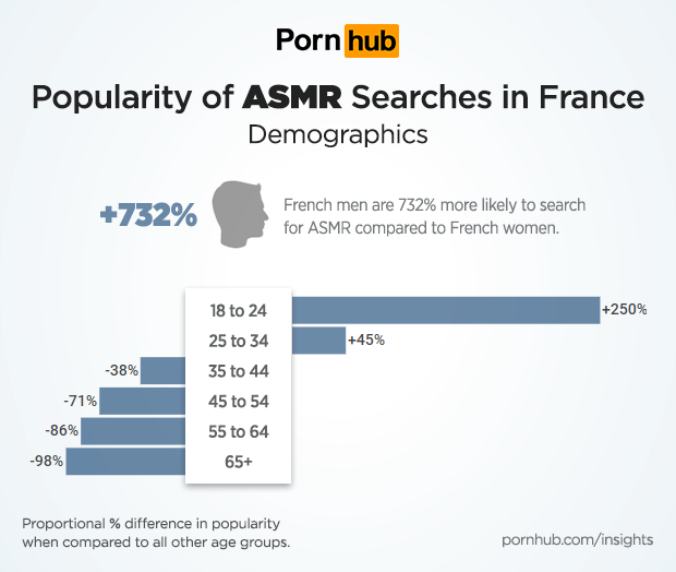 French men are 732% more likely to search for ASMR when compared to French women. When comparing age groups, ASMR is much more popular with French Millennials under the age of 35. In particular, French visitors between the ages of 18 to 24 are 250% more likely to search for ASMR when compared to all other age groups in France. Visitors over the age of 45 are at least -71% less likely to listen in to ASMR videos.