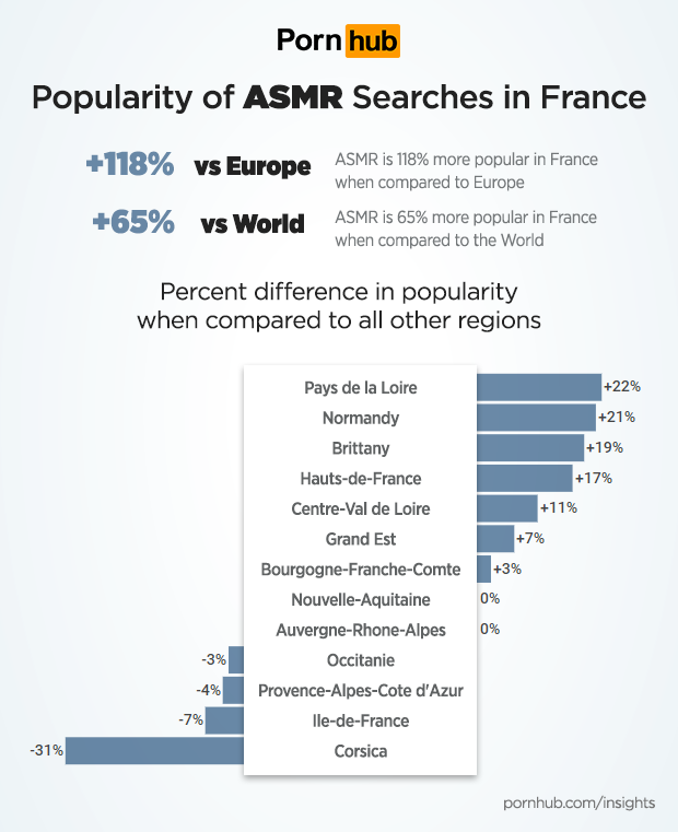 ASMR is proportionately 118% more popular among French visitors than those in the rest of Europe, and 65% more than the rest of the world. Within France, visitors from Pays de la Loire are 22% more likely to search for ASMR, whereas visitors from Corsica are -31% less likely to be interested in ASMR.