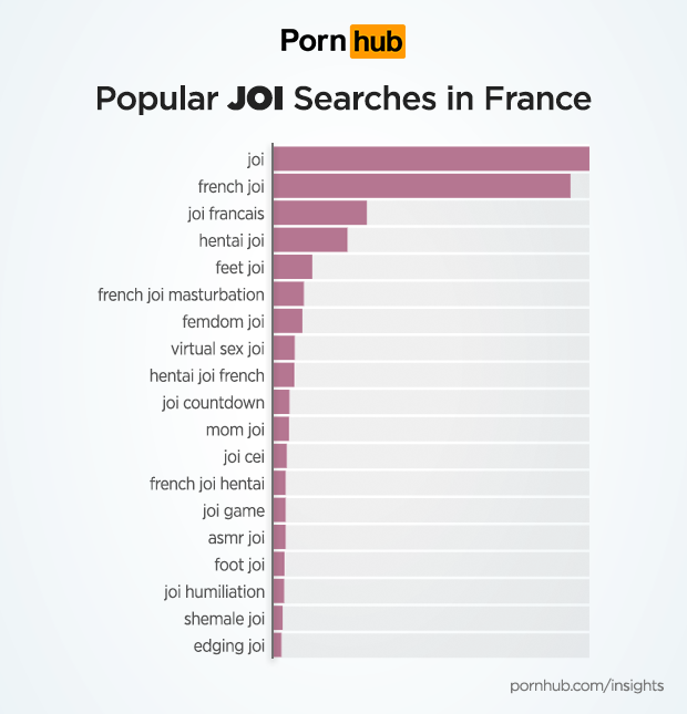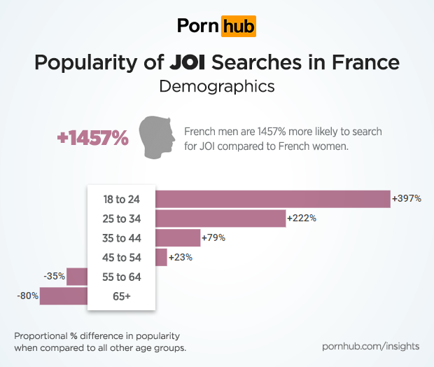 Perhaps unsurprisingly, it’s French men who are 1457% more likely to look for Jerk Off Instructions to accompany their jerking off. Once again, it’s French millennials under the age of 35 who are more likely to try out this form of verbal coaxing. Visitors from France between the ages of 18 to 24 are nearly 400% more likely to search compared to other age groups, while visitors over the age of 65 are -80% less likely to try JOI. Perhaps by that age no more instructions are necessary!