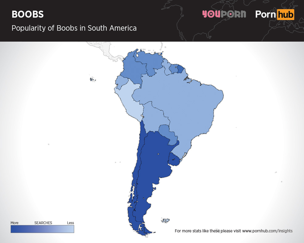 At an initial glance, it seems as though boobs reign in the north in terms of preference, whereas butts are better-liked in the south. Interestingly, virtually all of Africa, with the exception of Egypt, prefers backside-themed smut which is also the case in South America, save for Argentina where boobs top out for more related searches.