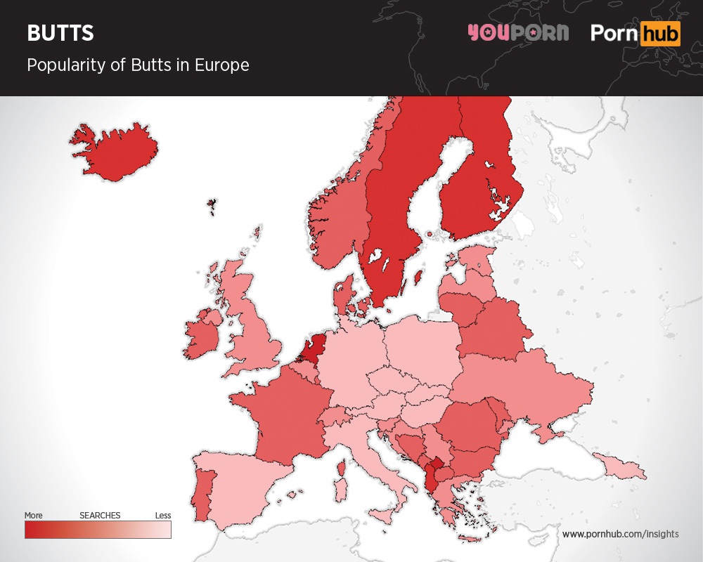 Are you a boob person or a butt person? The answer to this may be personal to some but is quite telling when examined within an international context. As a part of a special report with our friends over at 20 Minuten, today the Pornhub and Youporn statisticians have teamed up to take a look at which body parts are most lusted over in which parts of the world and as you’ll soon see, some very interesting trends emerge. For this exclusive report, the data represents the popularity of certain search results pulled from both Pornhub and Youporn’s anonymized data analytics, so let’s get started!