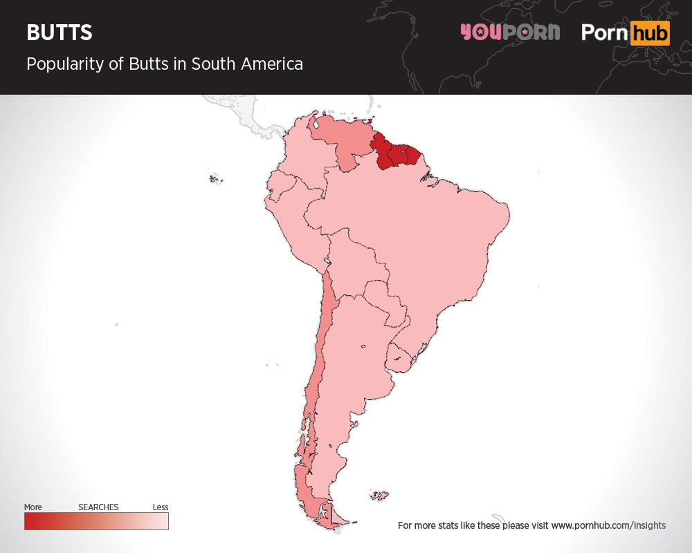 Once again, when looked at continent by continent, we are able to tease out which countries are the most butt-loving of them all. In Europe, Scandinavia and the Netherlands once again come in hot, as well as Iceland. There’s also some considerable ass-worship going on in the Balkans, with Albania, Montenegro and Bosnia all heating up on the map with their high proportions of ass-oriented searches. Over in Asian and the Middle East, Saudi Arabia, Yemen and Tajikistan all are front-runners as are Guyana, Suriname and French Guiana in South America.