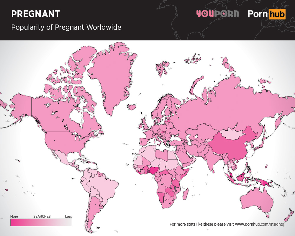 This is especially the case in Southeast Asia and Oceania.The Solomon Islands is where women with a bun in the oven are most sought out in searches on Pornhub and Youporn, with honorable mentions going out to Lesotho and Papua New Guinea. Malaysia slides in at 8th place and Indonesia in 12th, with China ranking 26th worldwide.