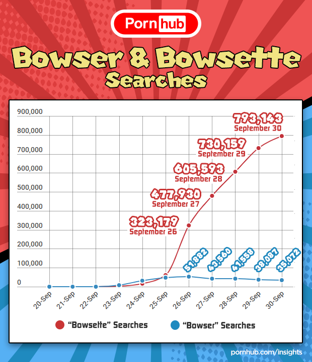 Bowsette searches didn’t exist before September 22nd, but appeared first on September 23rd and then grew exponentially. On September 26th, 323,179 people searched for “Bowsette” on Pornhub. Bowser also received some additional attention. While a few hundred people were already searching for “Bowser” on a daily basis, his searches reached as high as 51,882 on September 26th. The dynamic duo shelled out over 500,000 Pornhub searches in just over 72 hours!