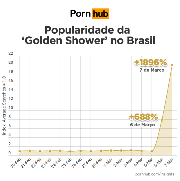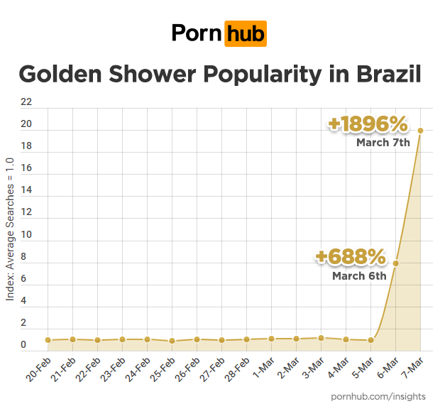 To appropriately answer their President’s question, dutiful Brazilians headed to Pornhub, where ‘golden shower’ searches increased by 688% on March 6th and 1896% on March 7th.