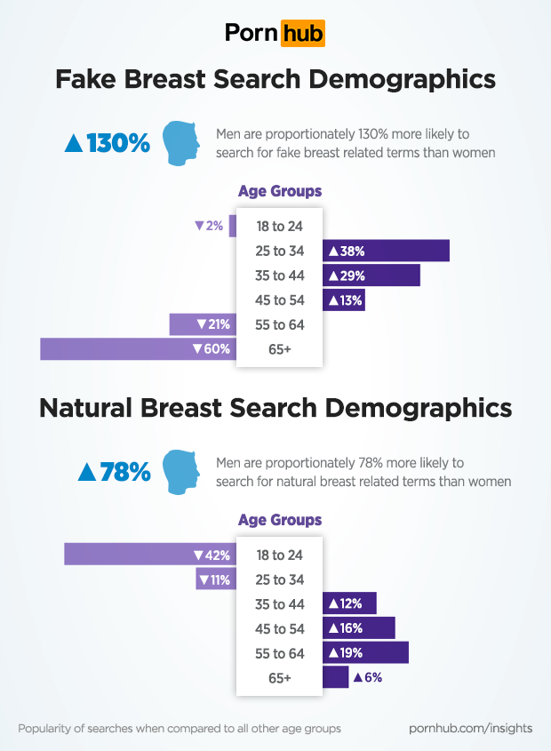 Proportionately, men are 130% more likely to search for fake breasts compared to women, and 78% more likely to search for natural breasts. Fake breasts are most popular with Pornhub visitors between the ages of 25 to 44, but the popularity of those “newfangled boob-balloons” is significantly lower with visitors over the age of 55. Conversely, natural breasts are far less popular with millennials between the ages of 18 and 34, while the real thing is most appreciated by visitors between the ages of 45 to 64.