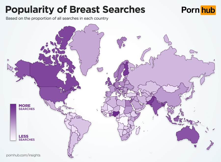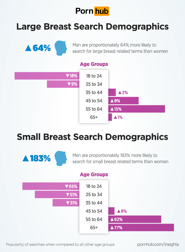 When it comes to who likes boobs the breast, it’s men who are 32% more likely to search for breast related terms when compared to women. Pornhub visitors between the ages of 18 to 24 are 19% less likely to search for breasts when compared to all other age groups, but visitors aged 55 to 64 are 17% more likely to search.