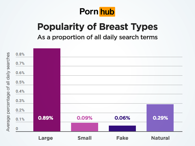 Overall, daily breast related searches number in the millions, making up around 1.5% of all searches entered on Pornhub each day. The following chart shows how the popularity of the four major breast types stack up next to each other. Large breast searches are ten times the size of small, and natural is around five times more popular than fake.