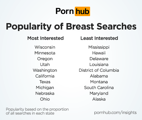 Now let’s take a look at how breasts stack up across the United States of America. Proportionately, the states most interested in search for breasts are Wisconsin, Minnesota, Oregon, Utah and Washington. Visitors from Mississippi, Hawaii, Delaware, Louisiana and the District of Colombia have the lowest proportion of searches.