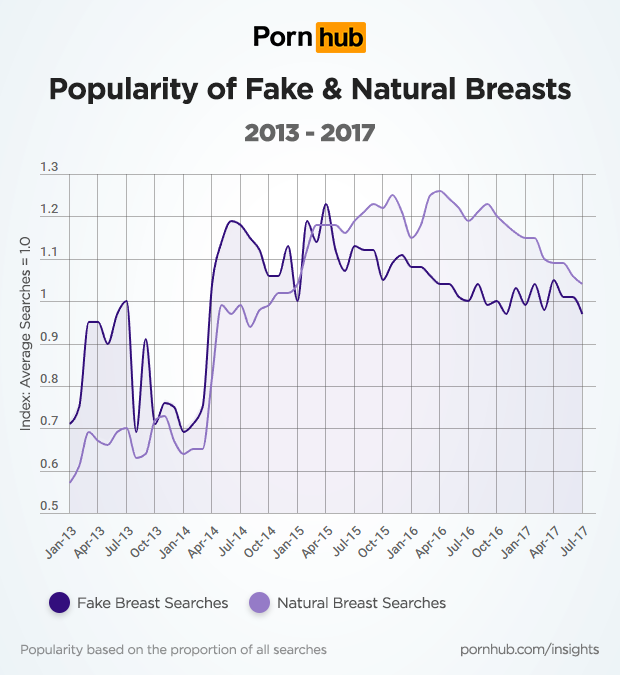 The following chart illustrates the changes in search popularity of both fake and natural breasts on their own scales (not in comparison to each other) from January 2013 to July of 2017.
