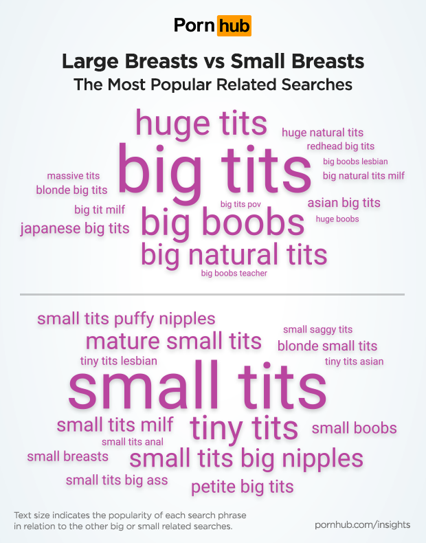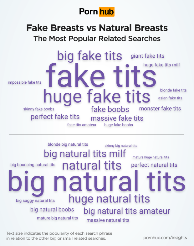 The number one breast related search on Pornhub is “big tits”, followed by “big boobs” and “huge tits”. It seems that authenticity is important to Pornhub’s visitors, as “big natural boobs” rank fourth overall — in fact any searches related to fake boobs don’t make the top 25 of breast related terms.