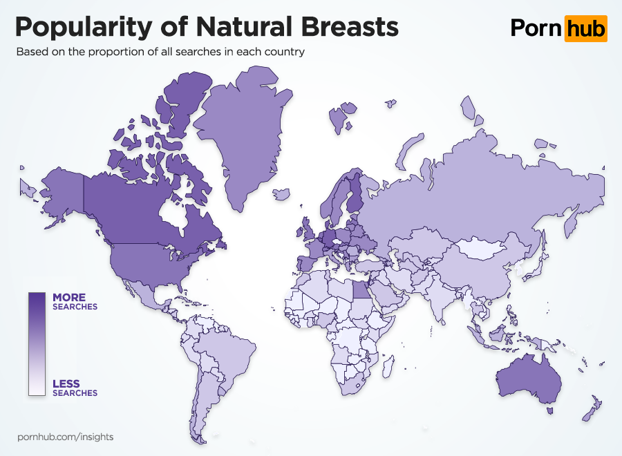 In this edition of Pornhub Insights, we’ll be getting abreast of a topic that’s near and dear to the heart of many Pornhub fans — Boobs! We paired up with our friends at Mashable to find out what the most popular breast related searches are, as well as what demographics, countries and states are most interested in searching for them. To shake things up, we’ll be breaking our stats into searches for big breasts versus small breasts, and also fake breasts versus the real thing.