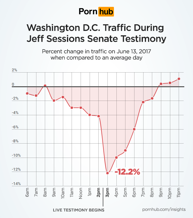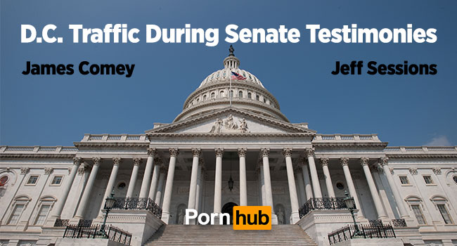 James Comey’s testimony began at 10am ET on June 8th, and compared to an average Thursday, traffic in the Washington D.C. region was down 10.1%. Traffic to Pornhub remained well below average until Noon hour, when it had a quick recovery and remained near normal levels for the rest of the day.
