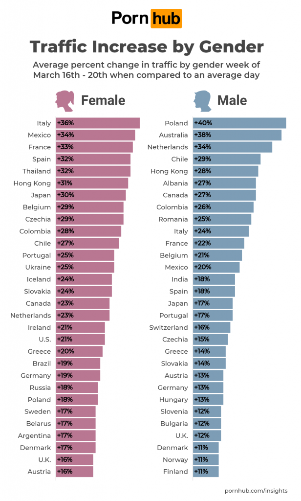 The following data shows how Pornhub’s traffic increased by men and women over the last month. The worldwide traffic changes were similar for both genders until the 16th of March when (proportionately) a larger number of women began visiting Pornhub than normal.