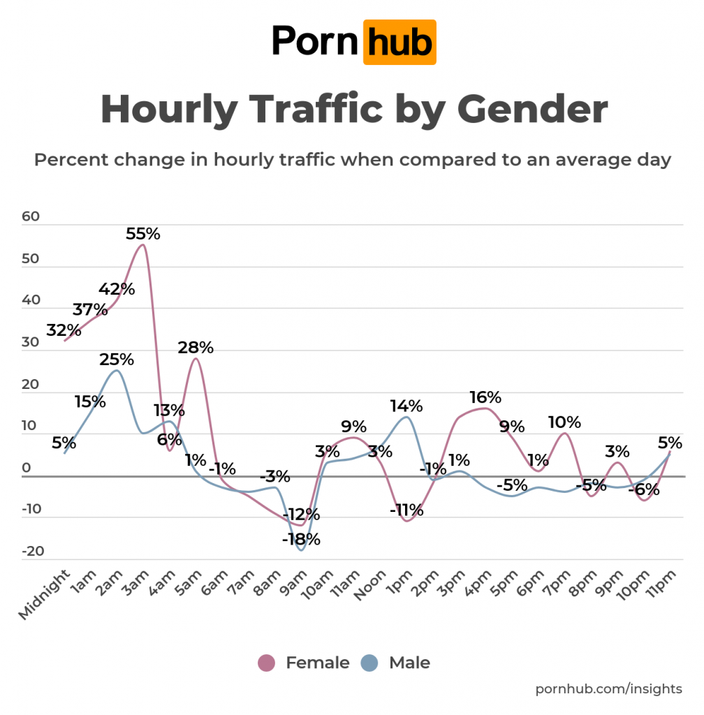 Not only did self-isolation efforts cause traffic for both genders to increase, it also led to men and women each visiting Pornhub at different times. When compared to an average day, women tend to visit Pornhub much more in the early morning hours from midnight to 3am when compared to men.