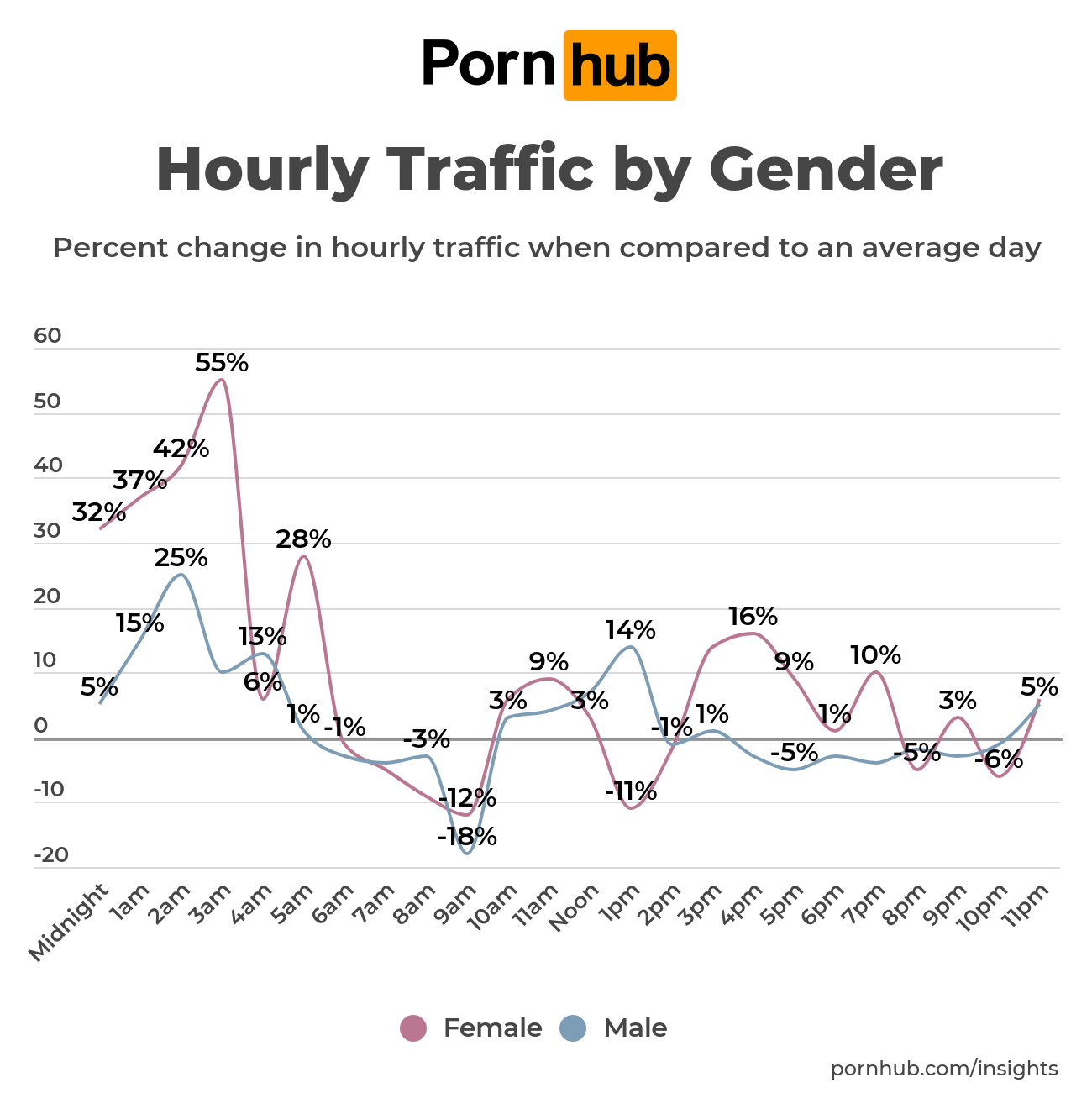 Traffic for both genders was below average at 9am before increasing above average mid-day. At 1pm, female traffic was -11% below that of an average day, while traffic from men was 14% above average. Throughout the rest of the afternoon, female traffic has higher than normal, while men tended to visit Pornhub a bit less than they normally would.