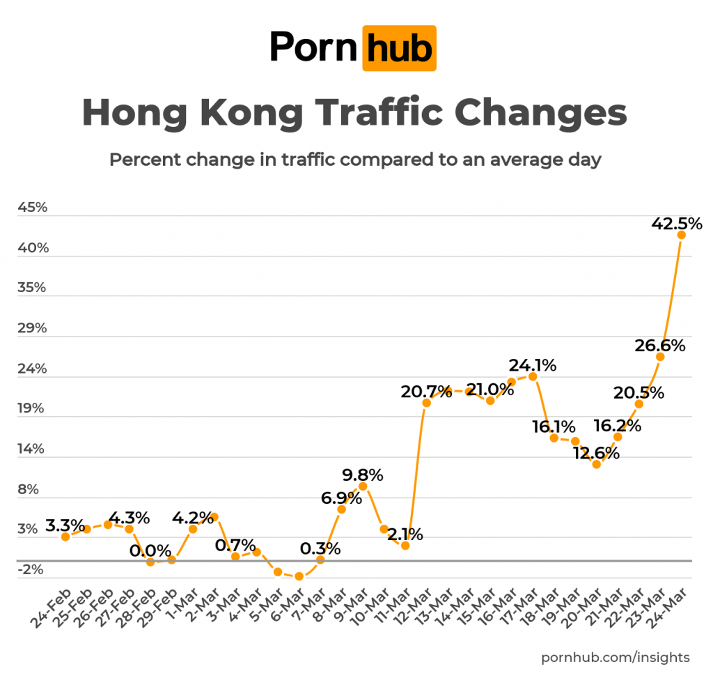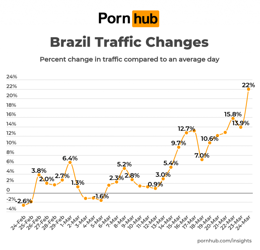 Comparisons were made to an average traffic period in February. Because traffic varies depending on the day of the week, each day was compared to the same day of the week during the average period. (You can see Pornhub’s normal traffic levels as detailed in our 2019 Year in Review).