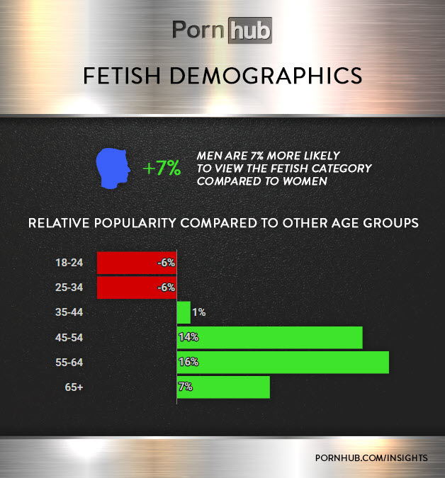 Proportionately, men are 7% more likely to view the Fetish category when compared to women. When compared to other age groups, Fetish videos are less popular with millennials between the ages of 18 to 35. Fetish popularity is highest with visitors aged 45 to 64.
