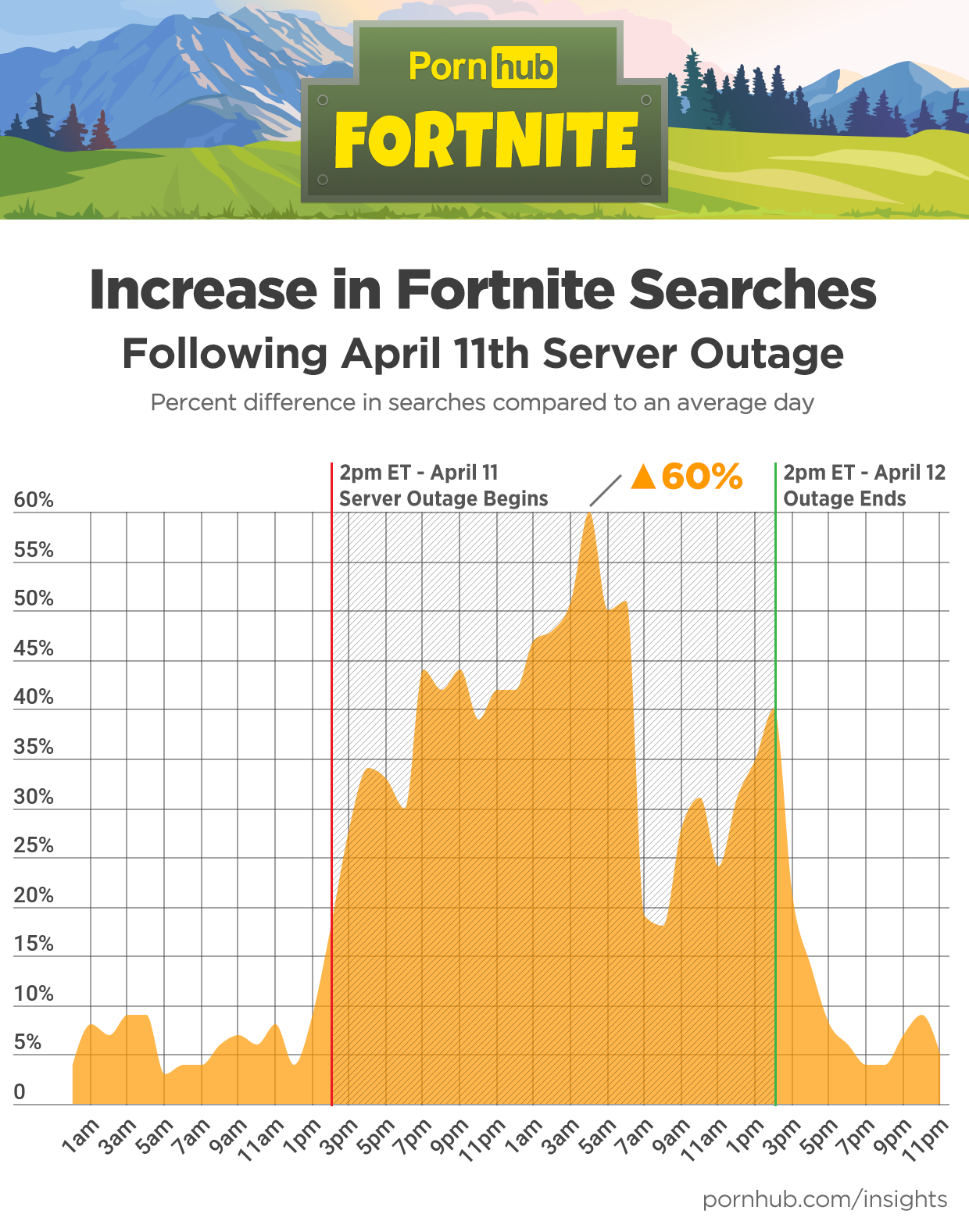 At 2pm ET on April 11th, servers for the popular online shooter Fortnite went down, and remained offline until 2pm the following day. The team at PCGamesN asked if this downtime might have affected searches and traffic to Pornhub.