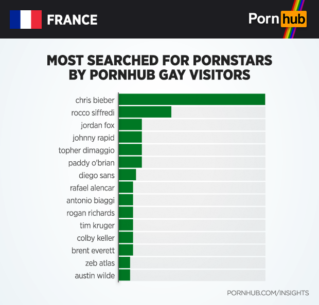 Currently the most searched for pornstar by Pornhub’s gay visitors is Chris Bieber — a Belgian performer who got his start in adult entertainment performing as a Justin Bieber look-alike. He gained notoriety when he was photographed with Justin Bieber, and currently has 150,000 Twitter followers. The second most searched pornstar is Rocco Siffredi, who performs in straight porn videos.
