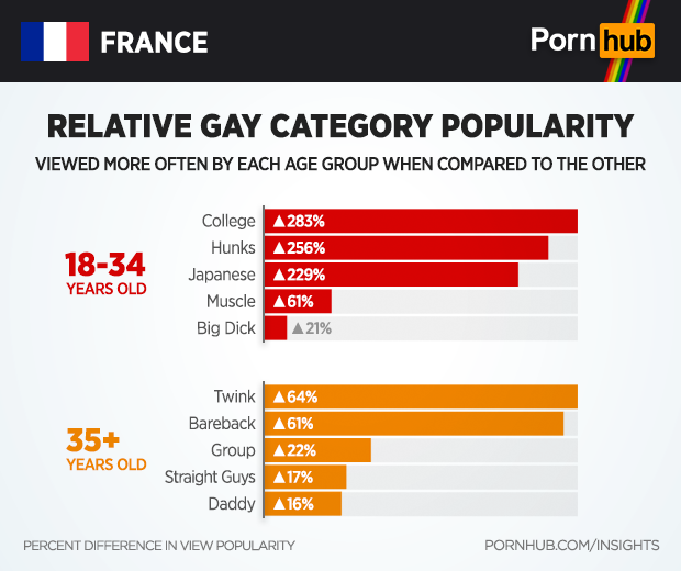 When compared to visitors over the age of 35, French visitors between the ages of 18-34 are 283% more likely to view the gay College category, and 256% more into gay Hunks. When compared to younger viewers, French visitors over the age of 35 are 64% more interested in Twink (nsfw) videos, and 61% more into Bareback.