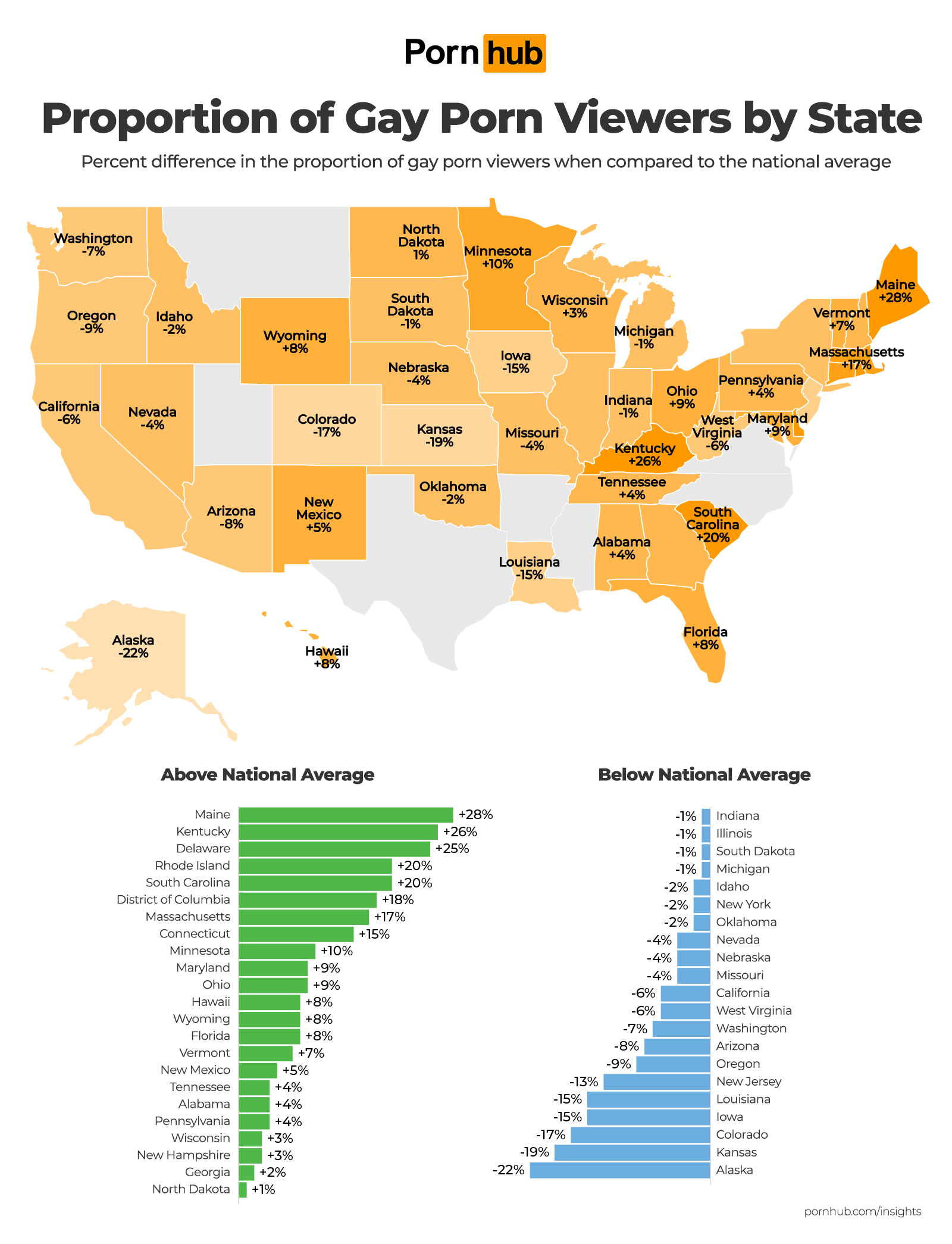The gayest state in America is Maine. Residents of the state are +28% more likely to search for gay porn. After Maine was Kentucky, where they were +26% as likely, followed closely by Delaware at +25%. The next two most likely to watch gay porn were Rhode Island and South Carolina, both at +20%.