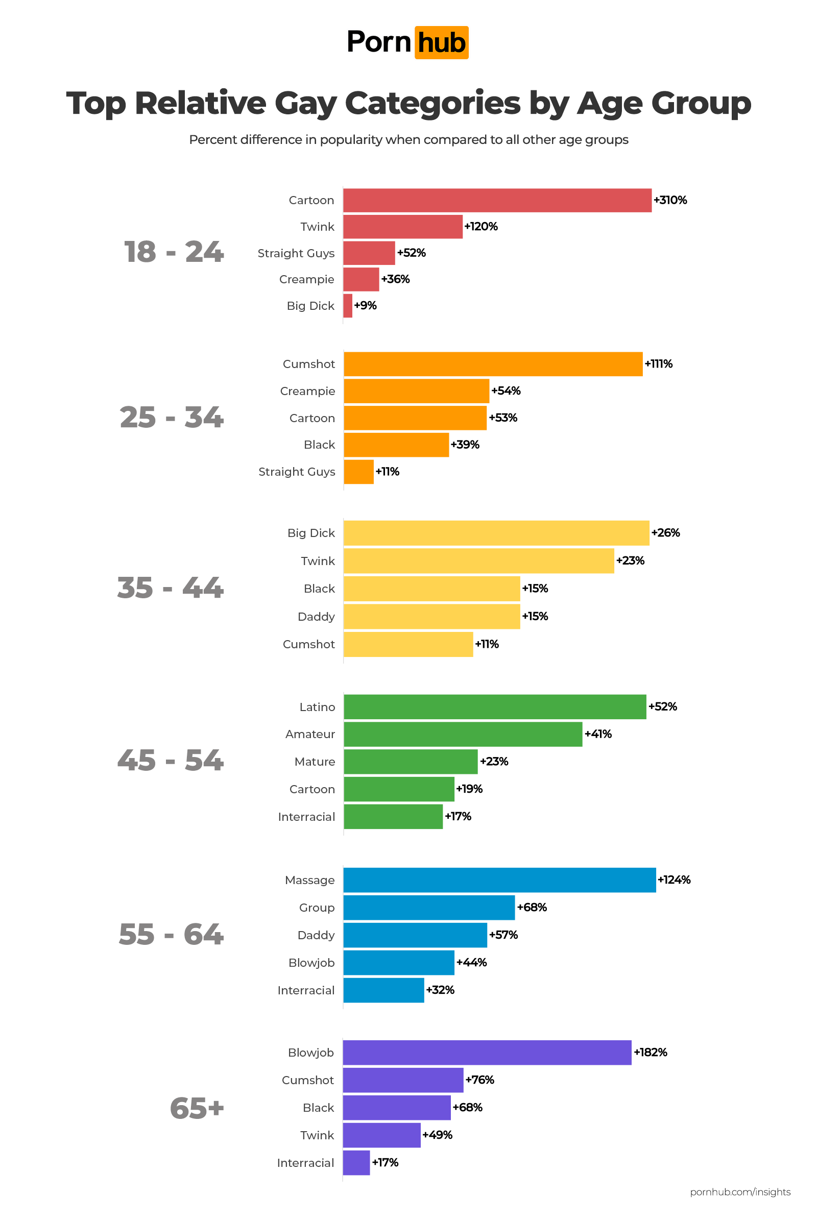 And finally, the 65+ age group loved the Blowjob category, being +182% more likely to view it. They also enjoyed Cumshot at +76% and Black at +68%.